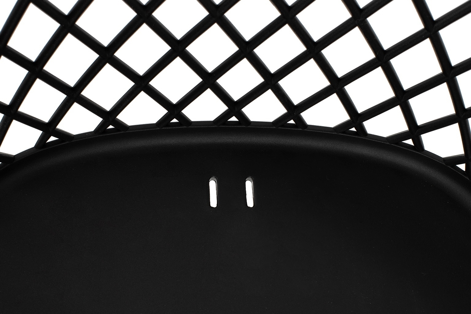 • Krzesło BINN. Ciekawy, ażurowy design połączony z praktycznym zastosowaniem. Siedzisko zostało w całości wykonane z polipropylenu w czarnym matowym kolorze. Metalowa podstawa i szerokie siedzisko sprawiają, że krzesło jest stabilne i komfortowe. Wymiary: