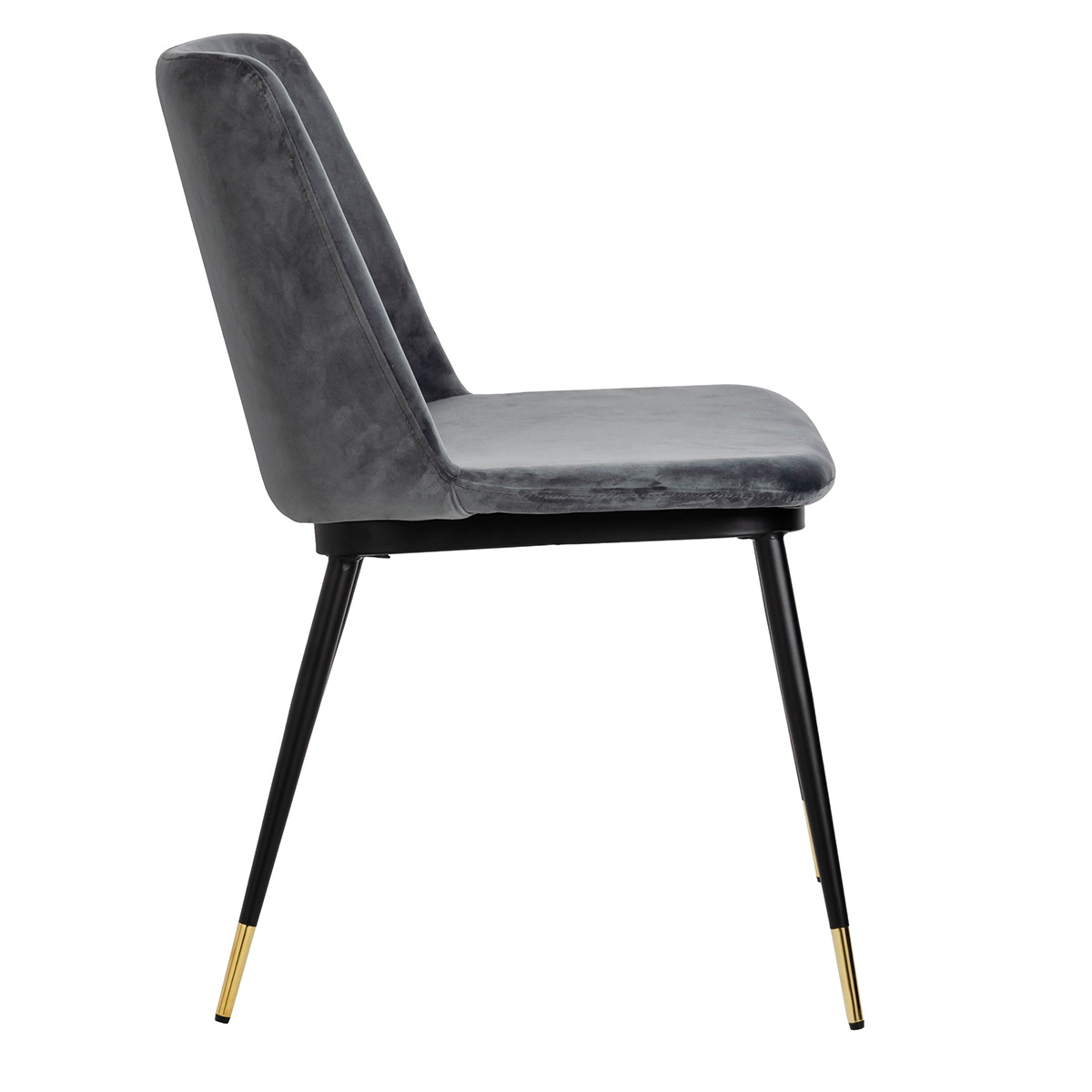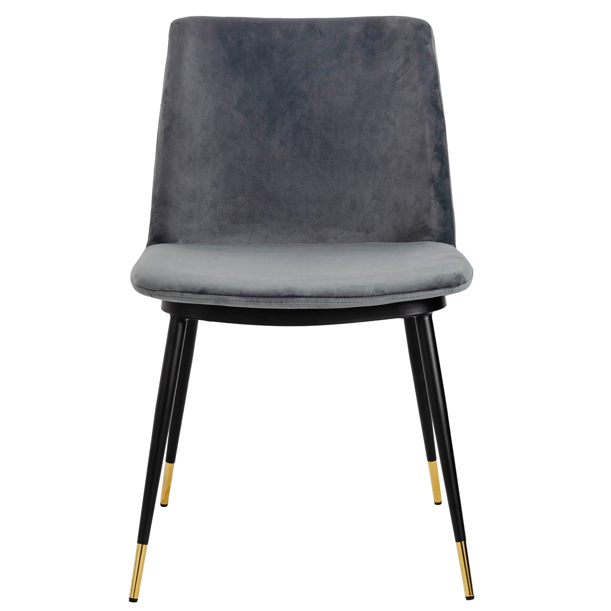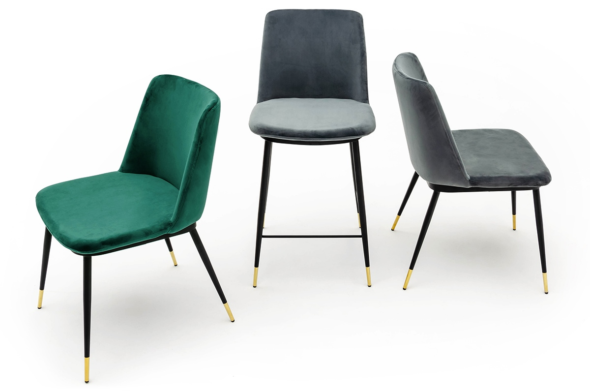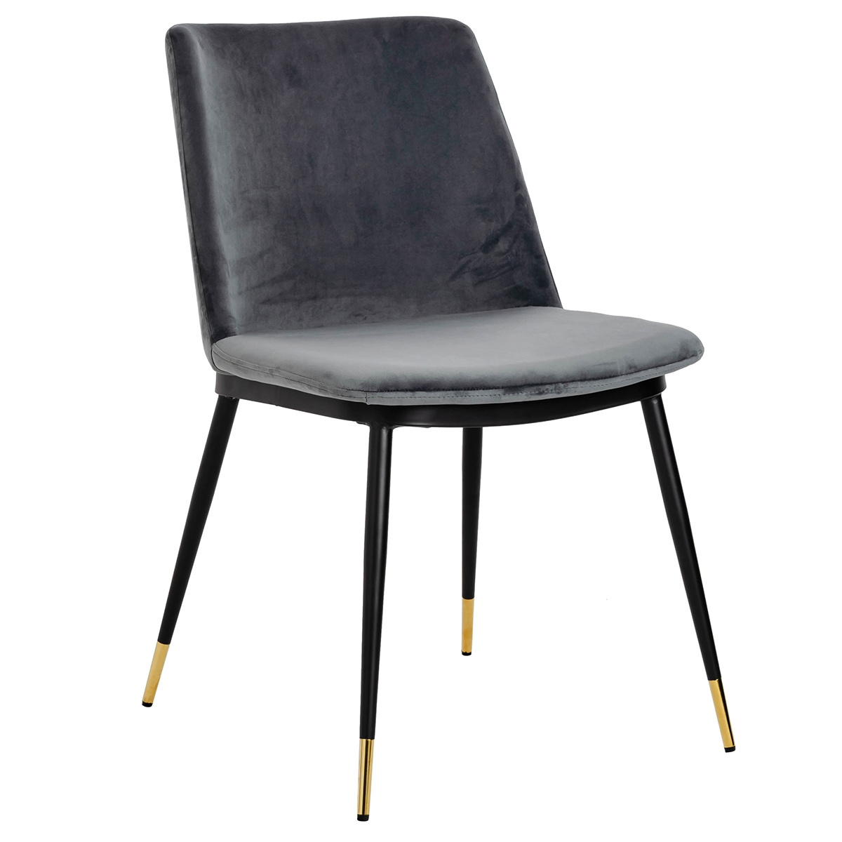 - Krzesło Diego w kolorze ciemny szary. Siedzisko i oparcie tapicerowane miękkim i przyjemnym w dotyku welurem. Konstrukcja z metalu w kolorze czarnym z satynowym wykończeniem. Ciekawym elementem dekoracyjnym są złote zakończenia nóg. Krzesło doskonale odna