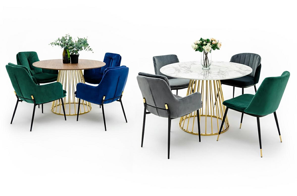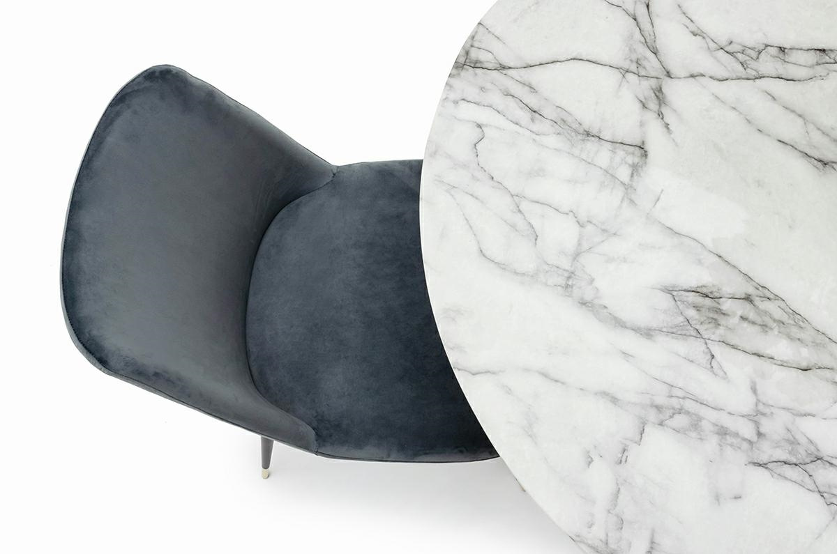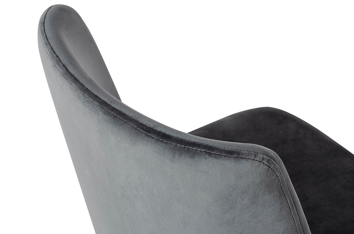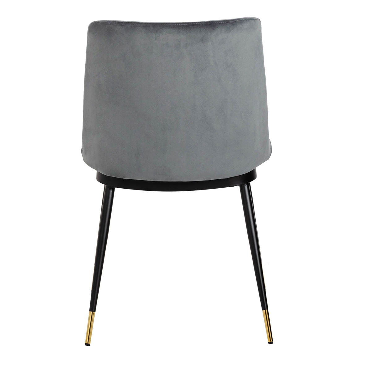 - Krzesło Diego w kolorze ciemny szary. Siedzisko i oparcie tapicerowane miękkim i przyjemnym w dotyku welurem. Konstrukcja z metalu w kolorze czarnym z satynowym wykończeniem. Ciekawym elementem dekoracyjnym są złote zakończenia nóg. Krzesło doskonale odna