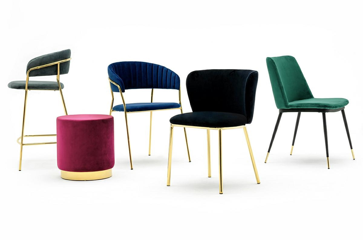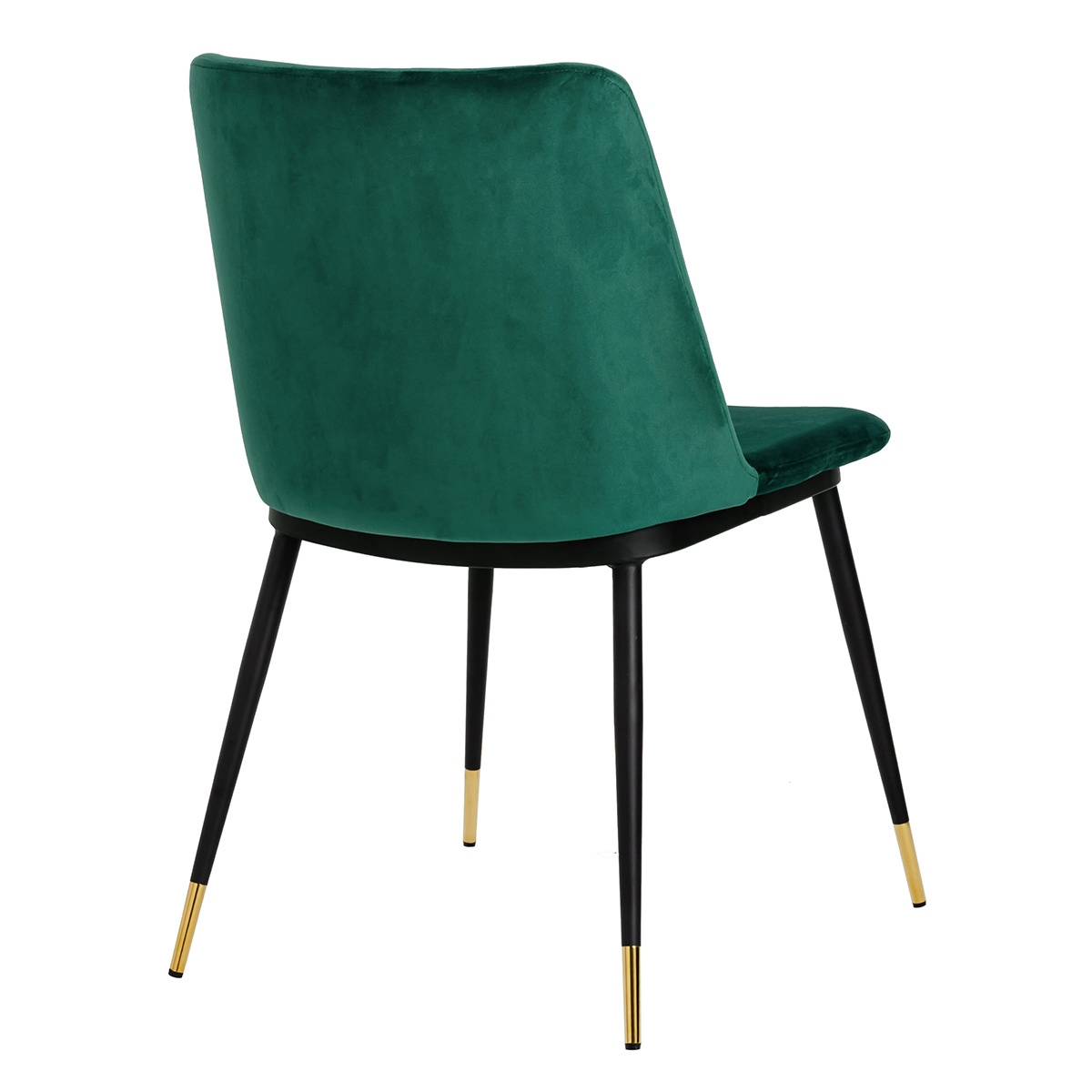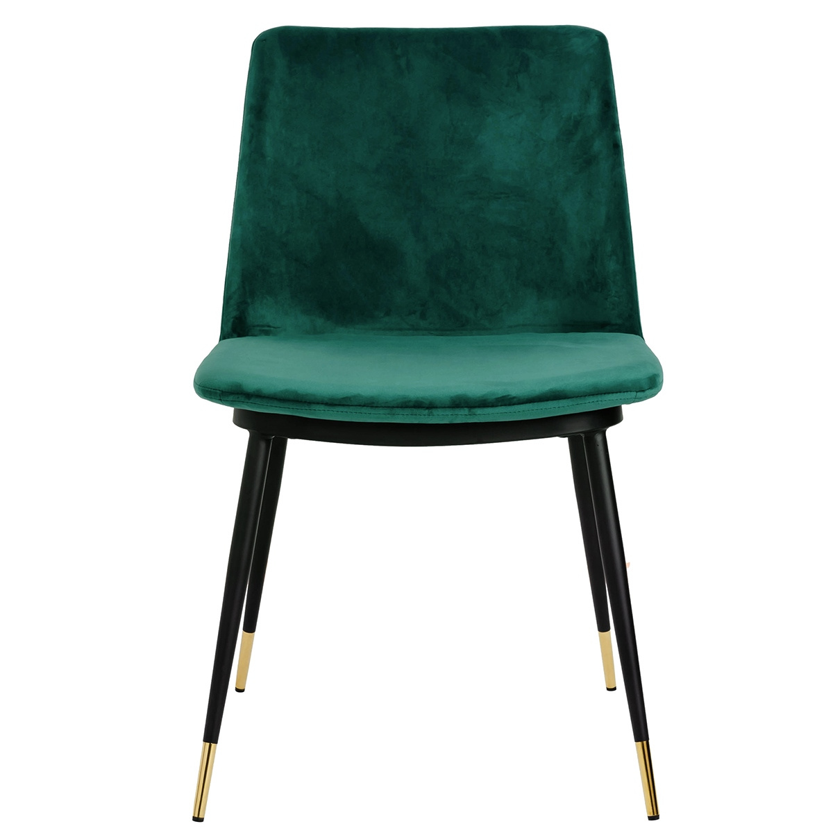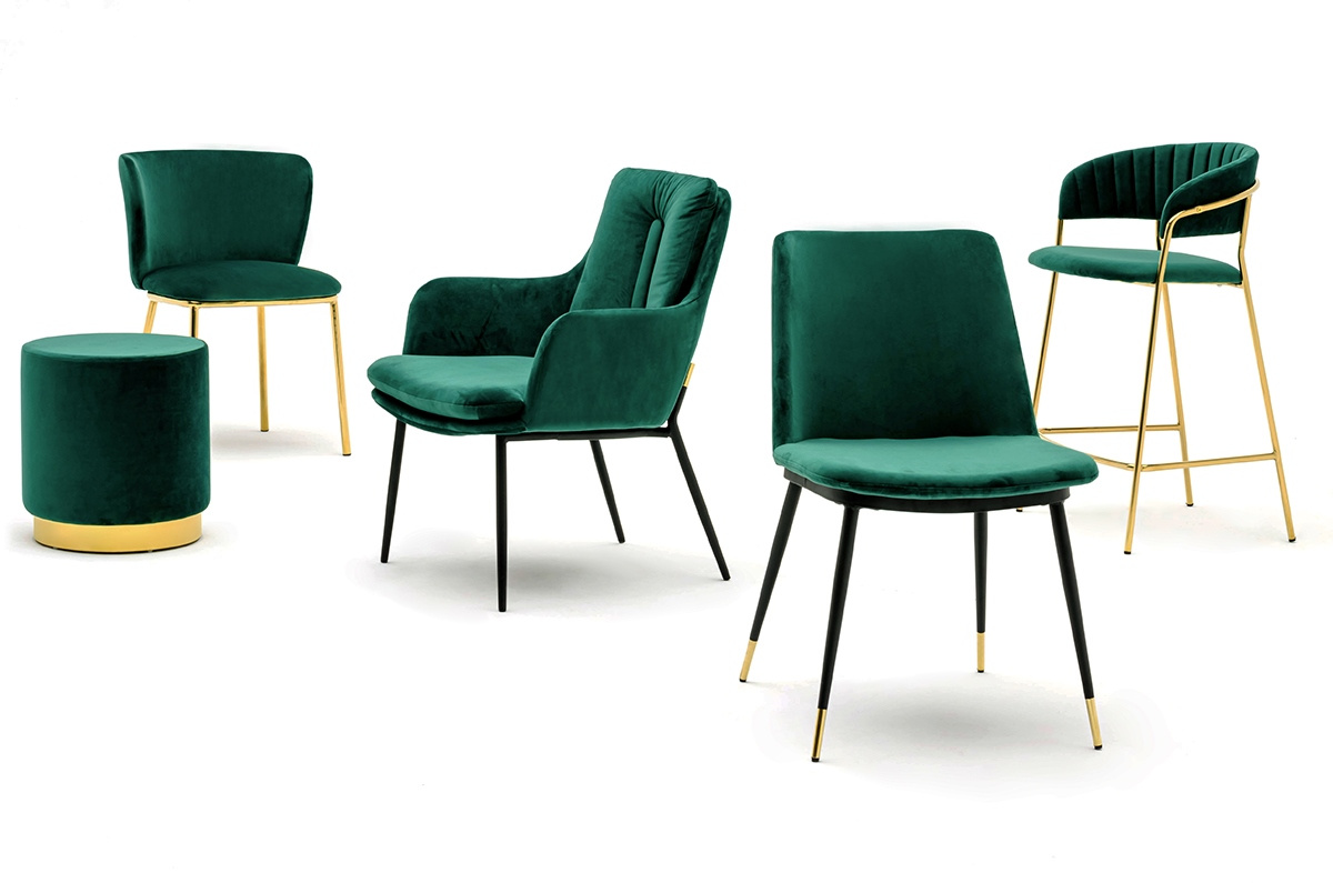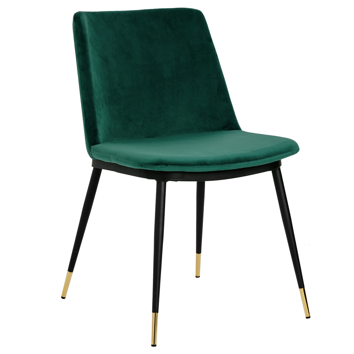 - Krzesło Diego w kolorze zielonym. Siedzisko i oparcie tapicerowane miękkim i przyjemnym w dotyku welurem. Konstrukcja z metalu w kolorze czarnym z satynowym wykończeniem. Ciekawym elementem dekoracyjnym są złote zakończenia nóg. Krzesło doskonale odnajdzi
