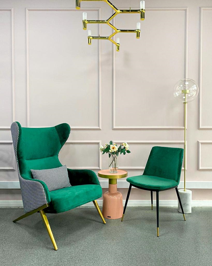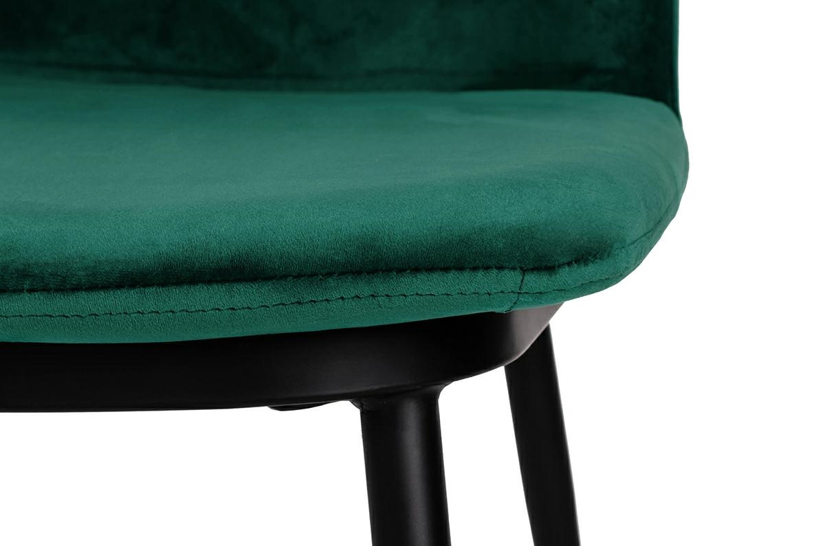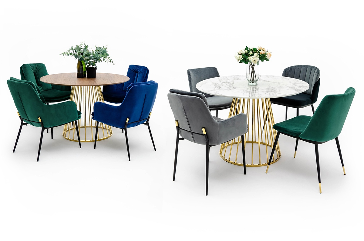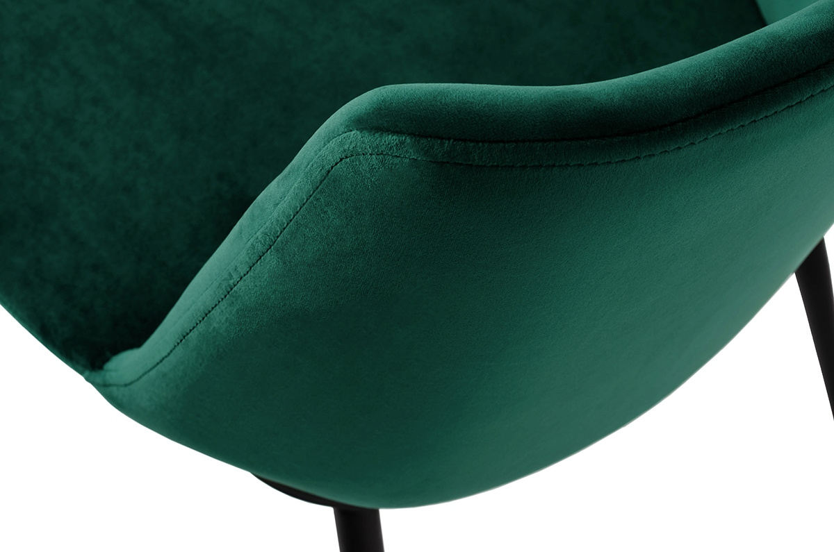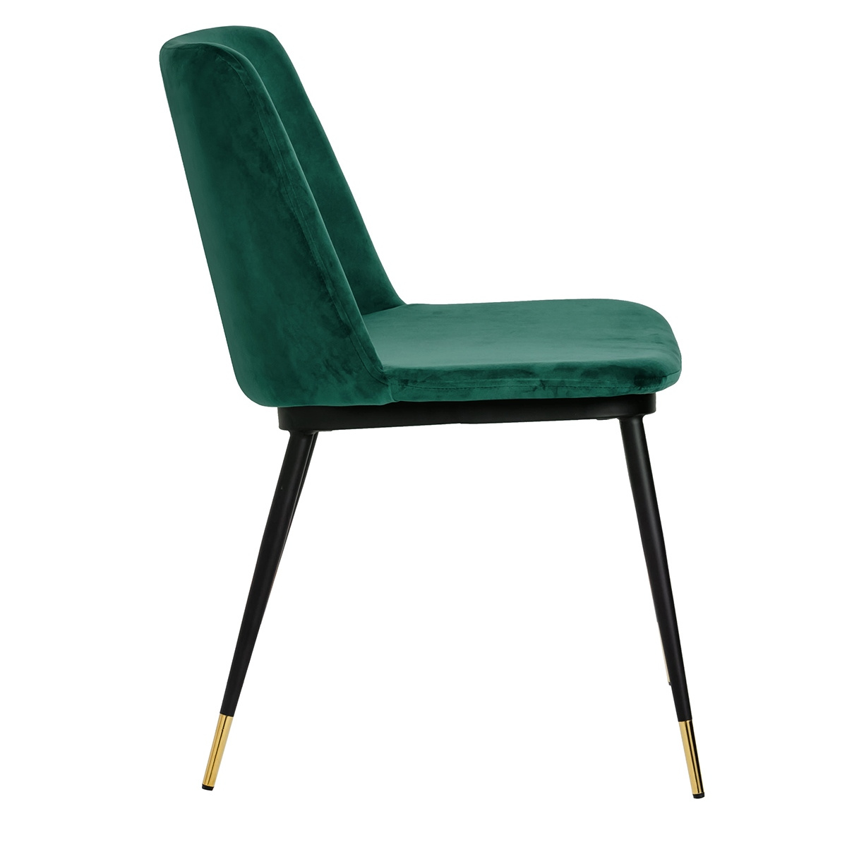 - Krzesło Diego w kolorze zielonym. Siedzisko i oparcie tapicerowane miękkim i przyjemnym w dotyku welurem. Konstrukcja z metalu w kolorze czarnym z satynowym wykończeniem. Ciekawym elementem dekoracyjnym są złote zakończenia nóg. Krzesło doskonale odnajdzi