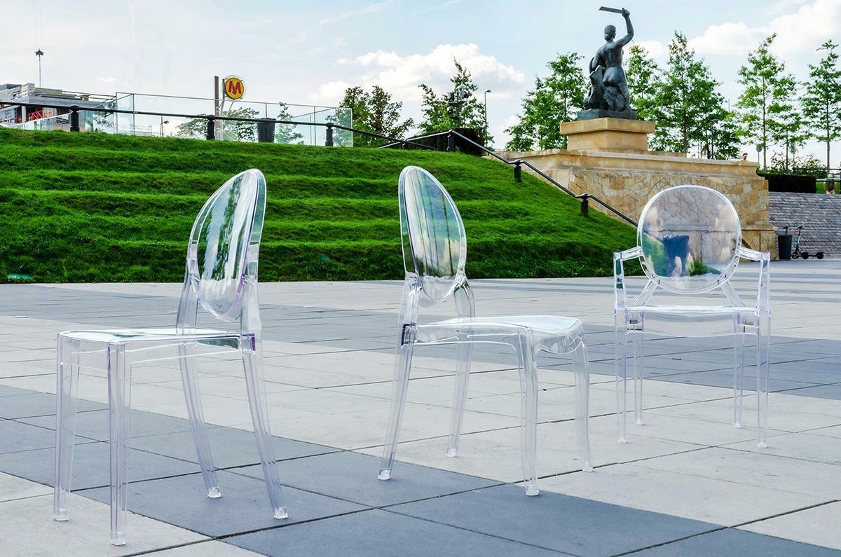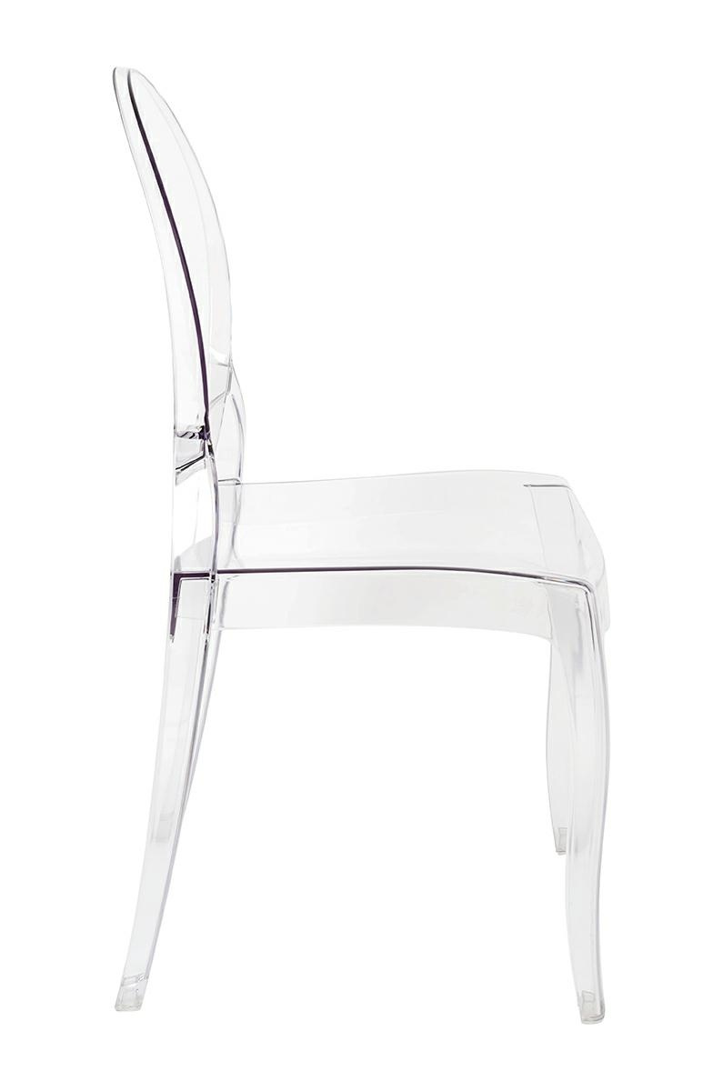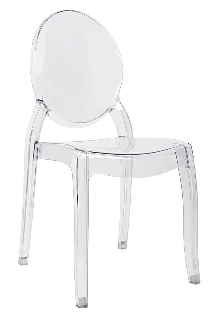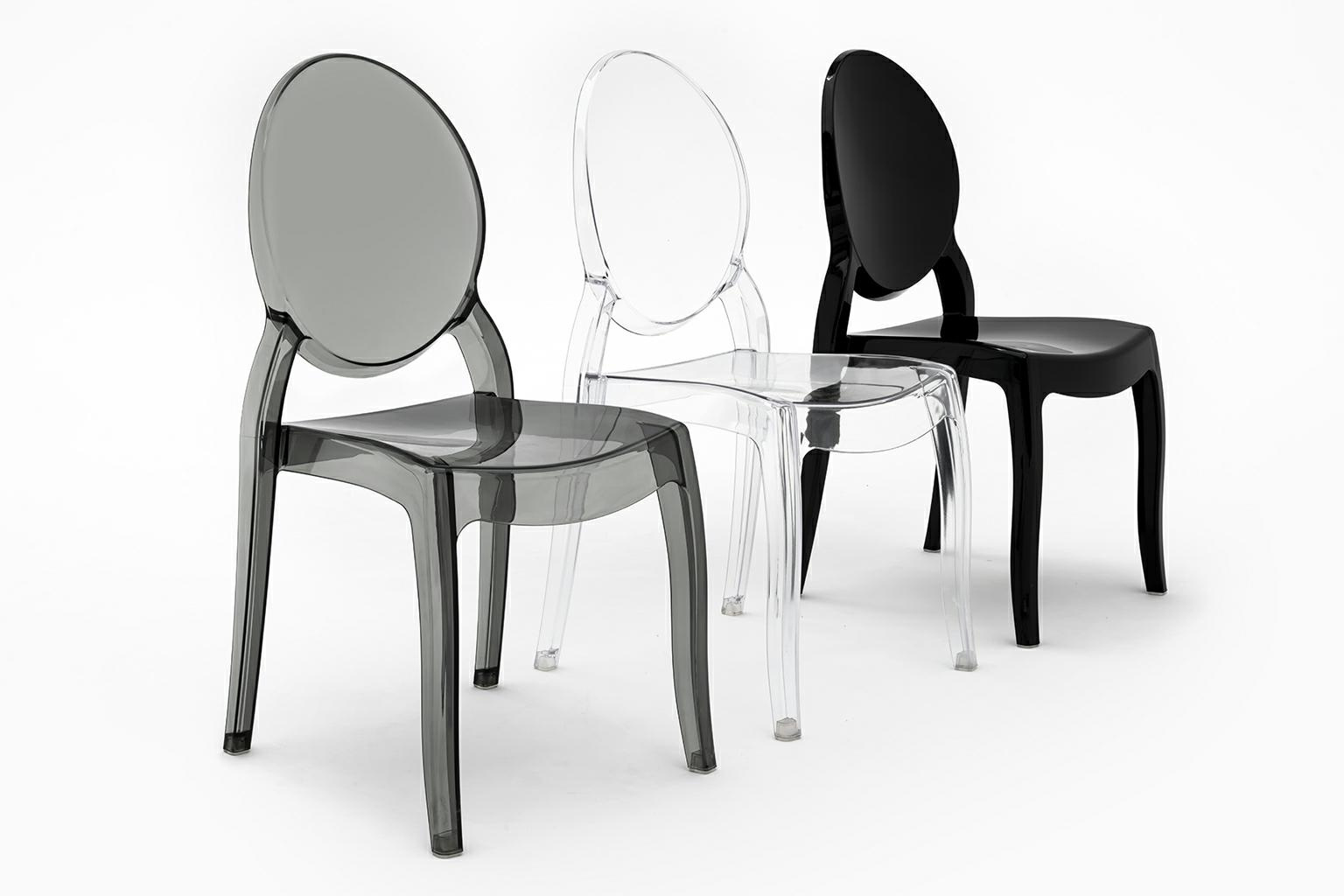 - Krzesło Elizabeth w całości zostało wykonane z wysokiej jakości transparentnego poliwęglanu. Poliwęglan jest wysoce odpornym na zarysowania oraz promienie UV tworzywem sztucznym. Dzięki czemu, krzesło można użytkować wewnątrz jak i na zewnątrz budynku. W