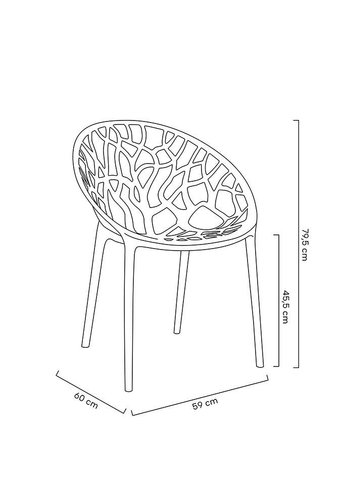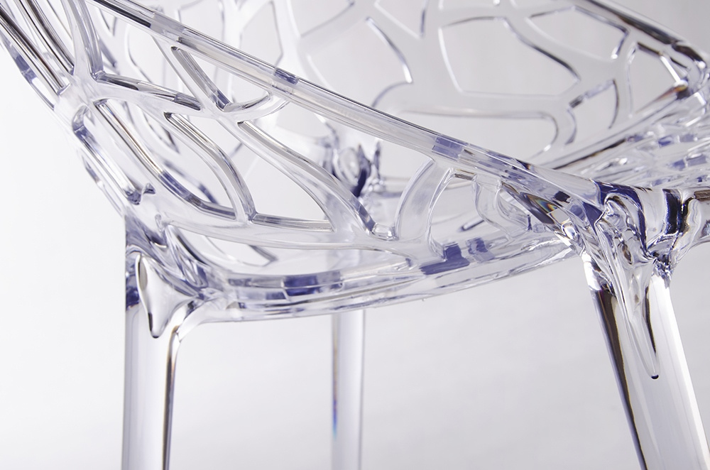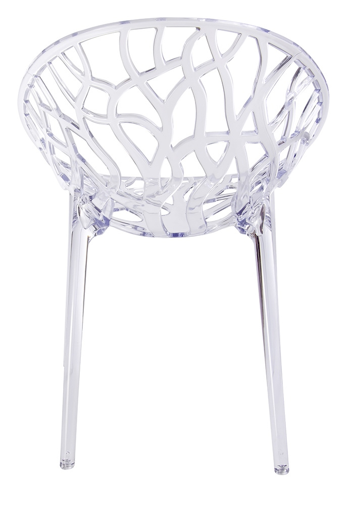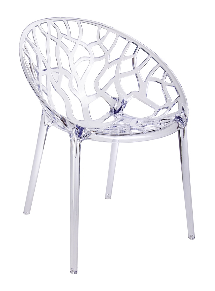 - Krzesło Koral w całości zostało wykonane z przezroczystego poliwęglanu. Charakterystyczne ażurowe wzory, dodają elegancji i czynią krzesło ciekawym dodatkiem każdego wnętrza. Krzesło sprawdzi się zarówno w nowoczesnym salonie, na tarasie lub balkonie. Krz