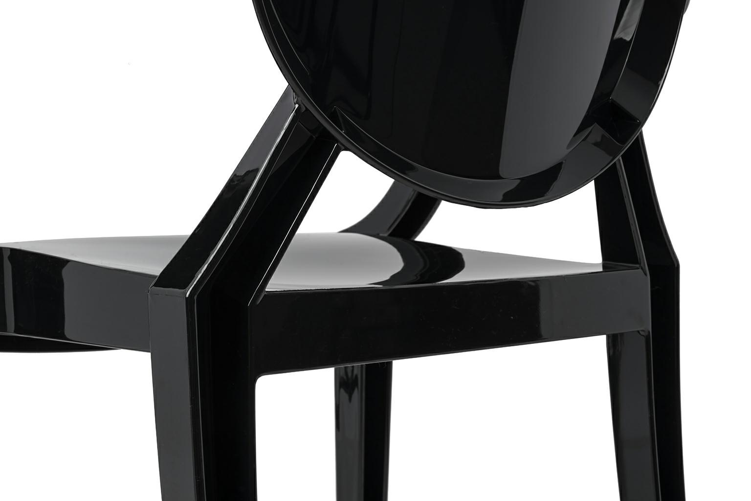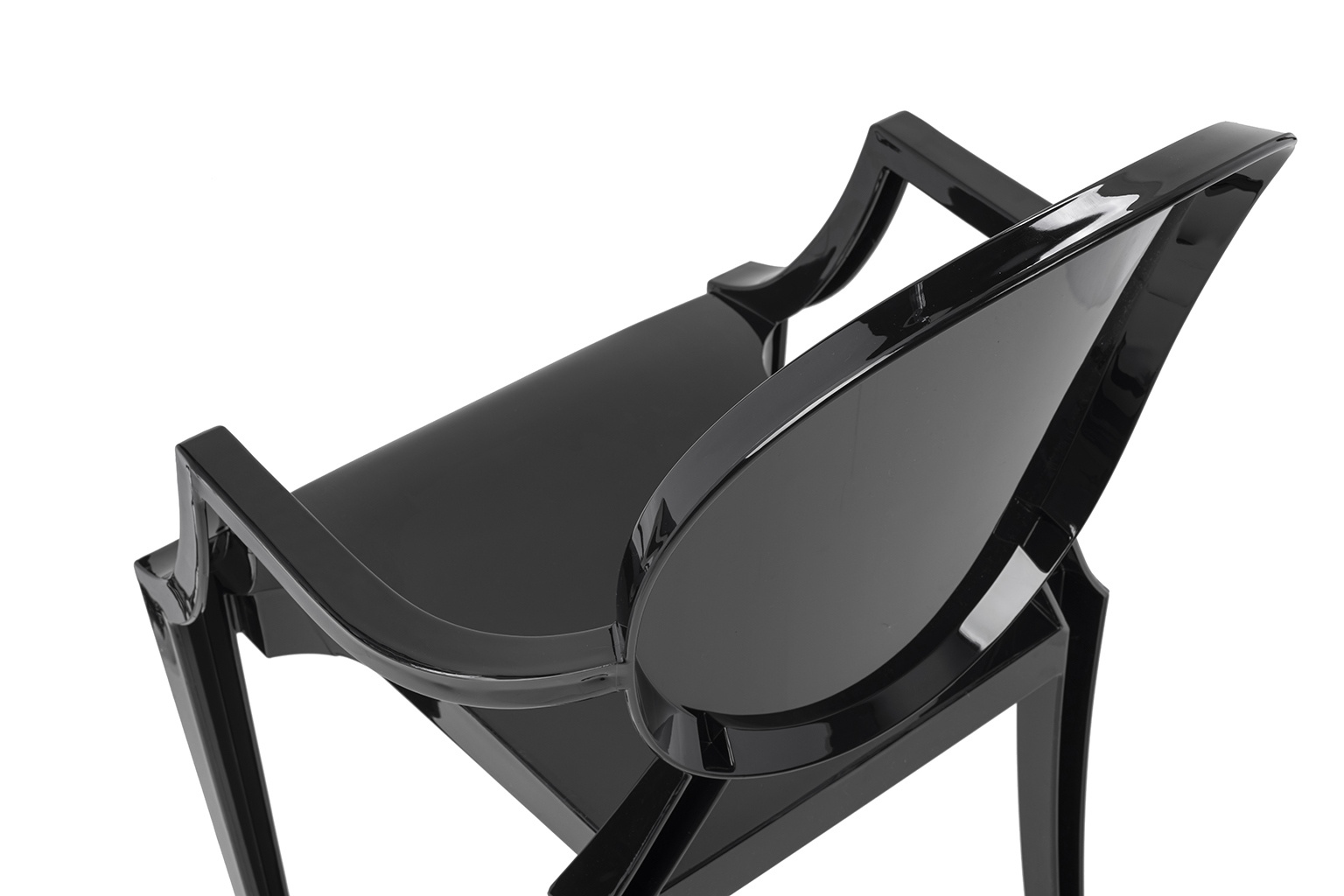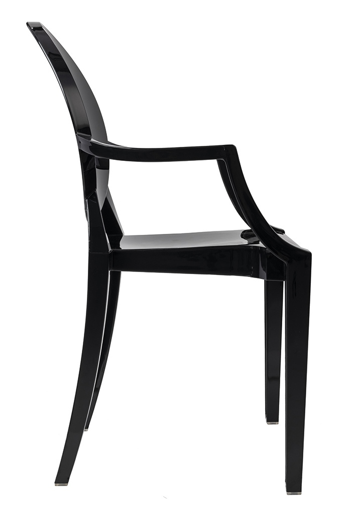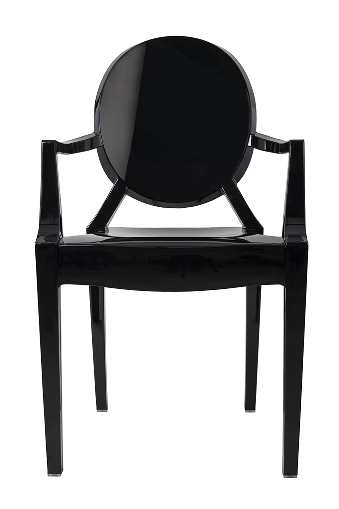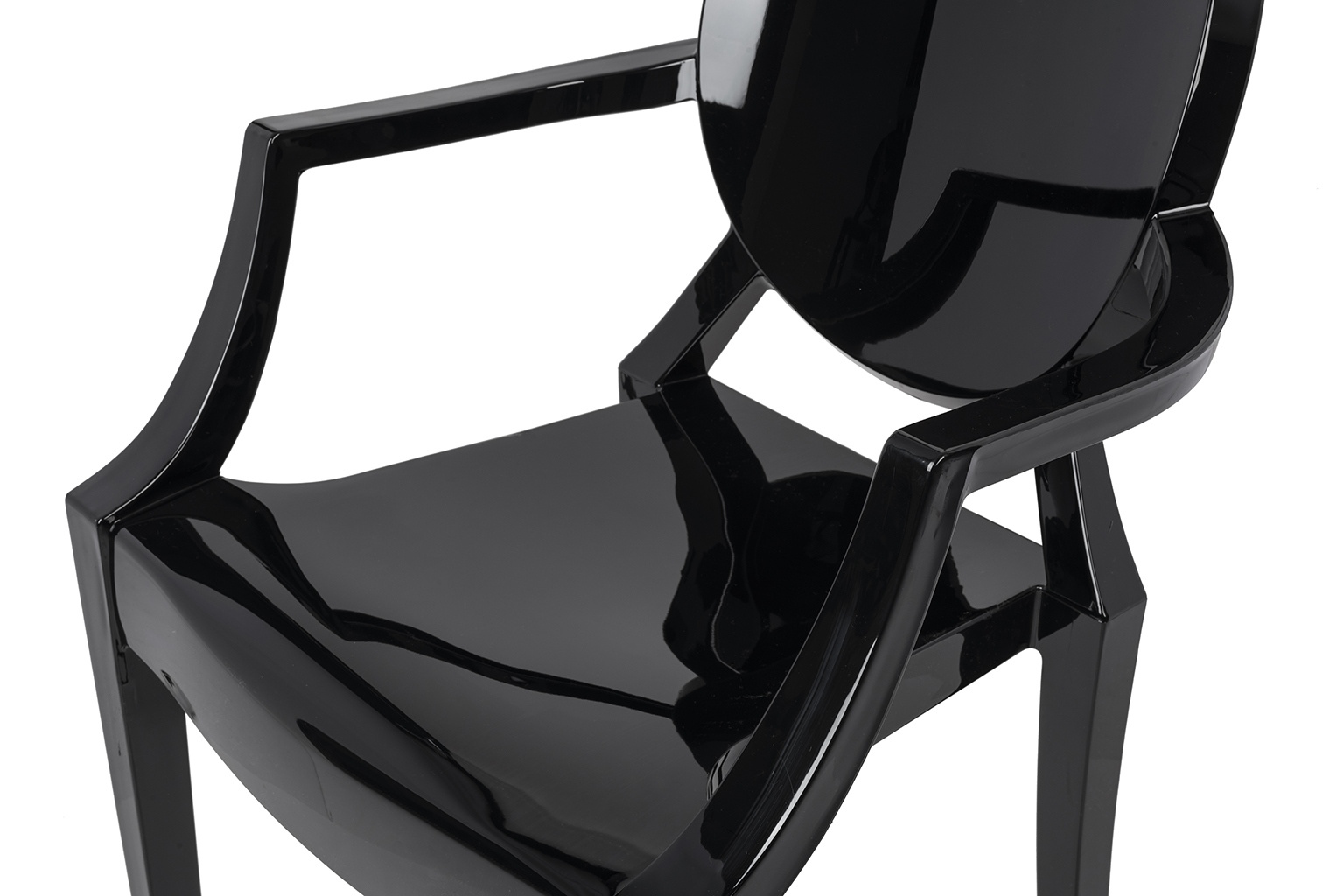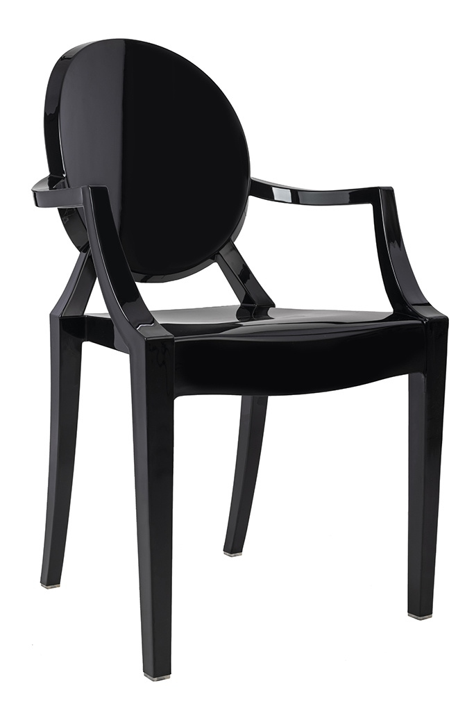 - Krzesło Louis w całości zostało wykonane z czarnego poliwęglanu Jest to bardzo wytrzymałe tworzywo, cechujące się dużą wytrzymałością (do 150 kg) oraz odpornością na uderzenia. Model ten nawiązuje stylem do mebli w stylu Ludwika XV. Dzięki zastosowaniu pr