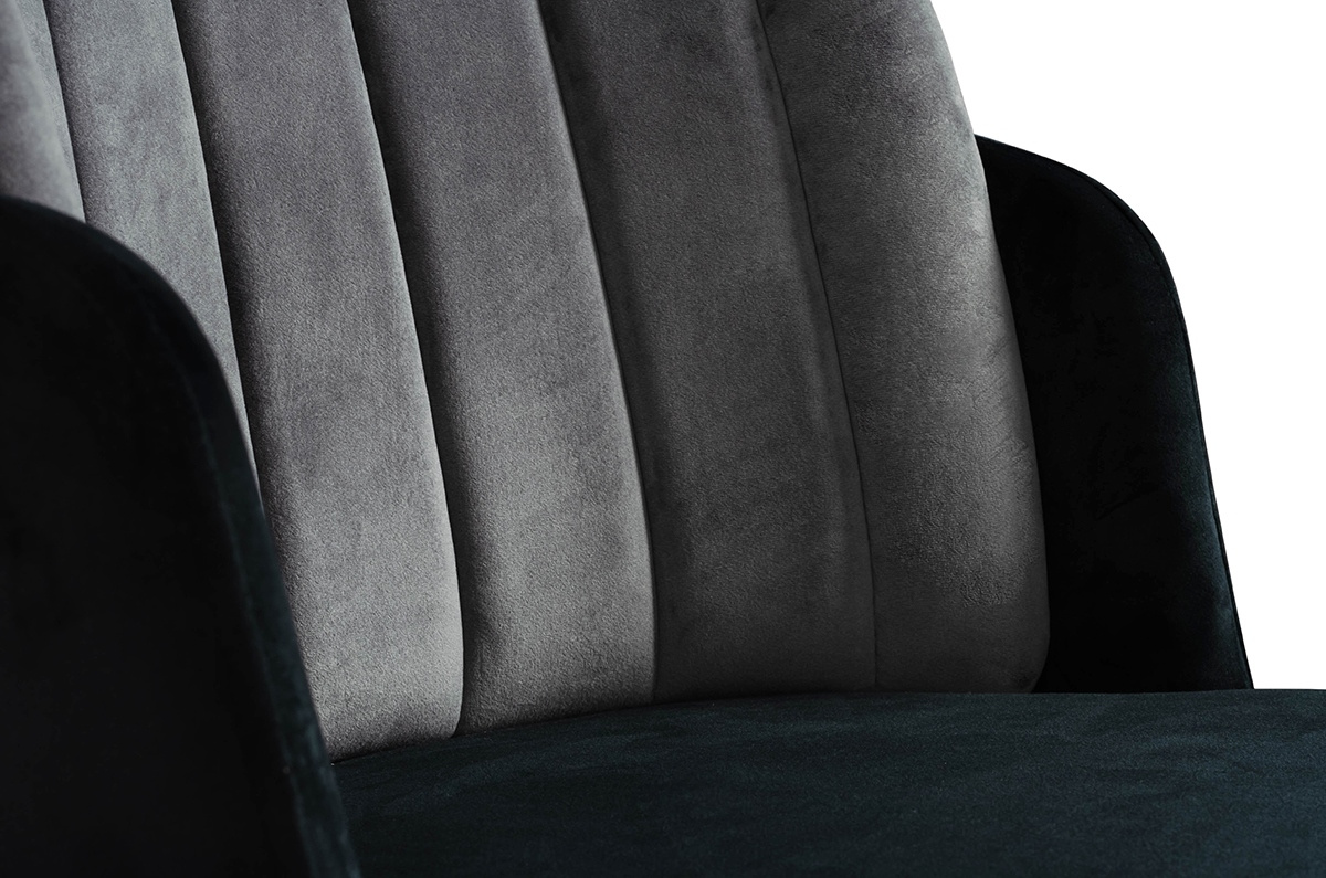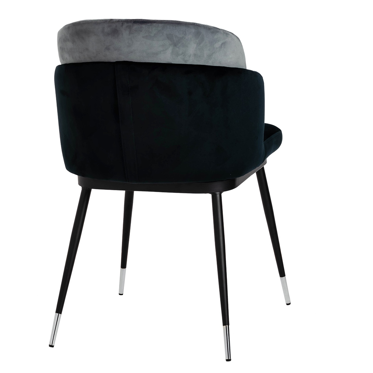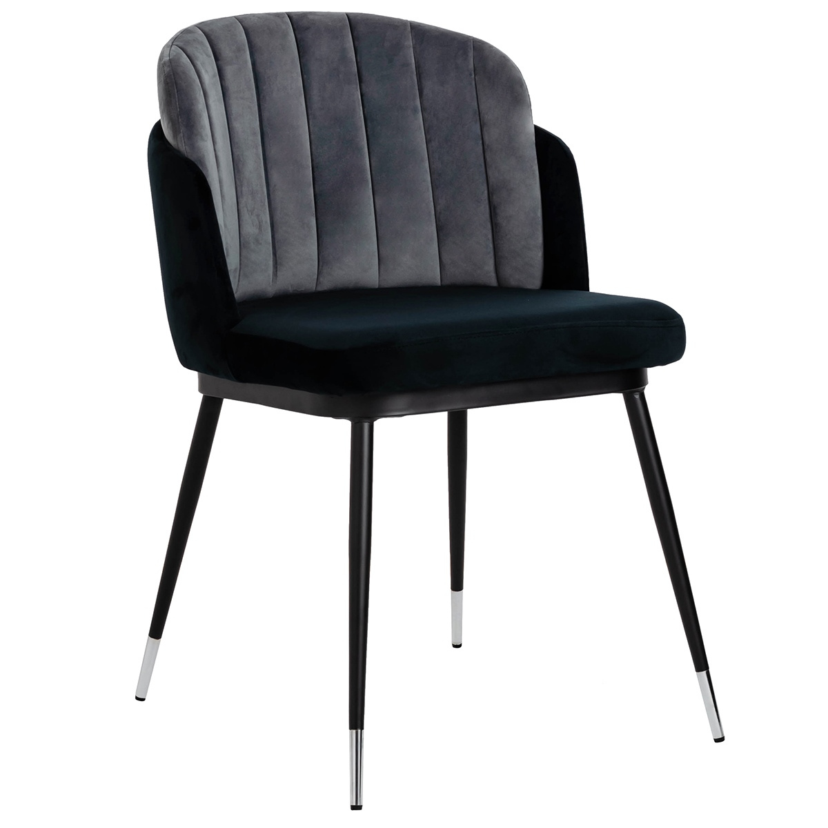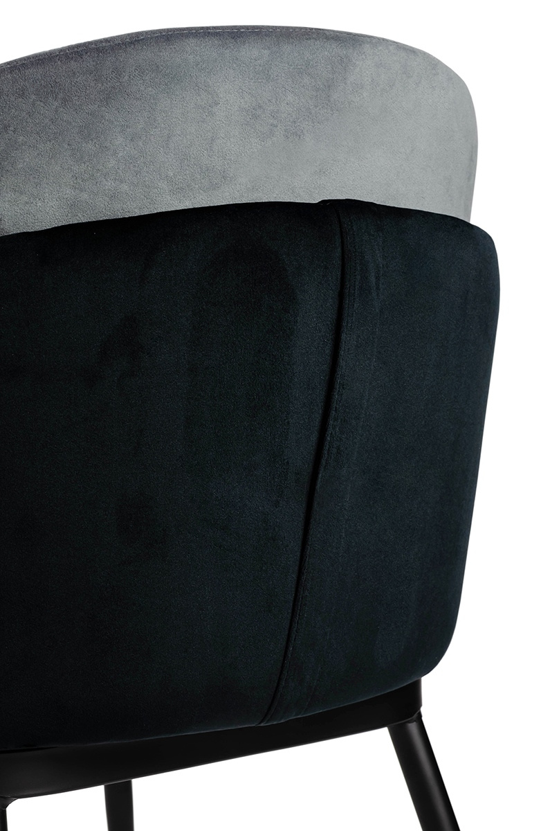 - Krzesło Marcel. Siedzisko i oparcie tapicerowane miękkim i przyjemnym w dotyku welurem. Siedzisko oraz część zewnętrzna oparcia w kolorze czarnym. Wewnętrzna strona oparcia jest w kolorze ciemny szary. Konstrukcja z metalu w kolorze czarnym, matowym. Deko