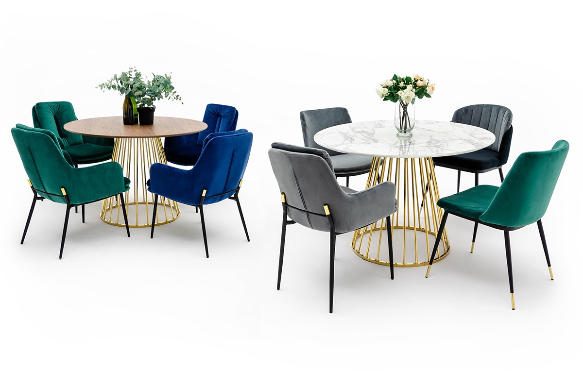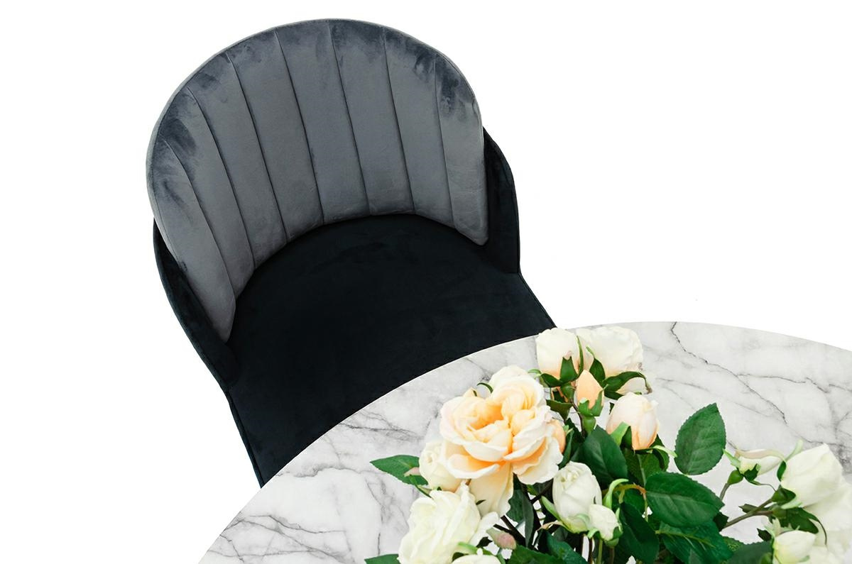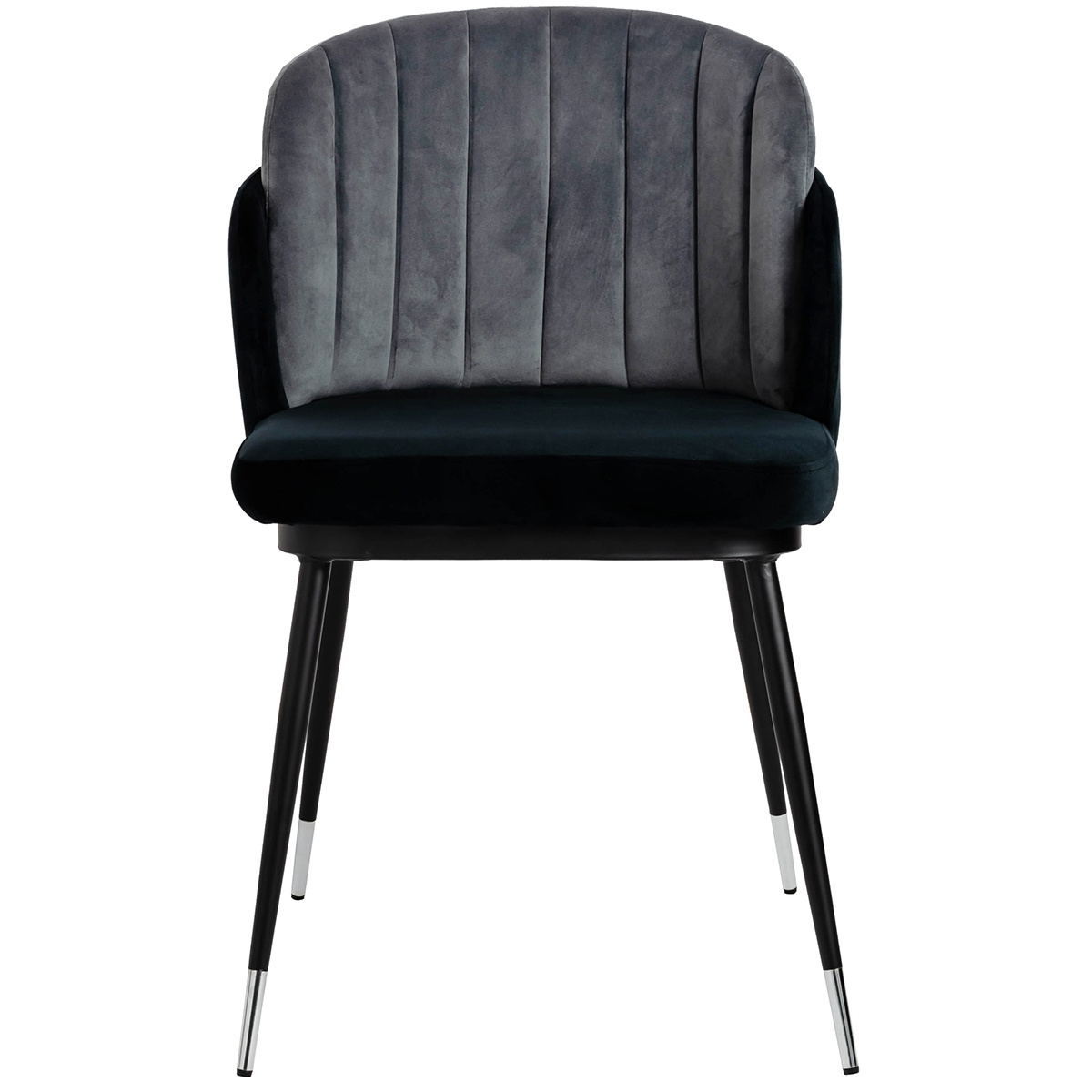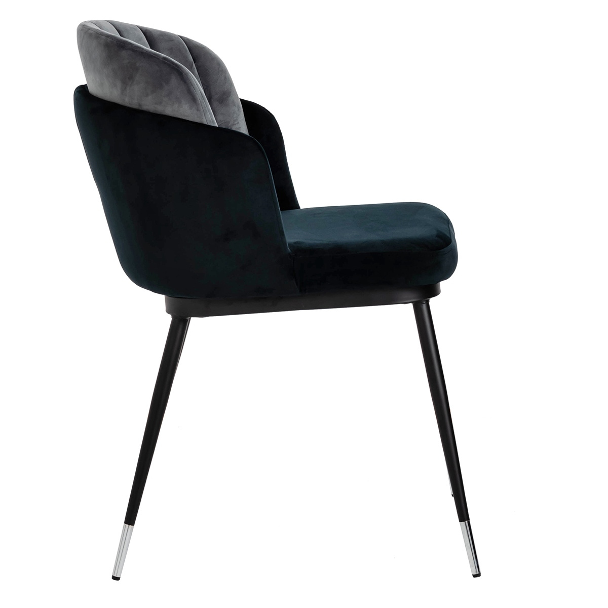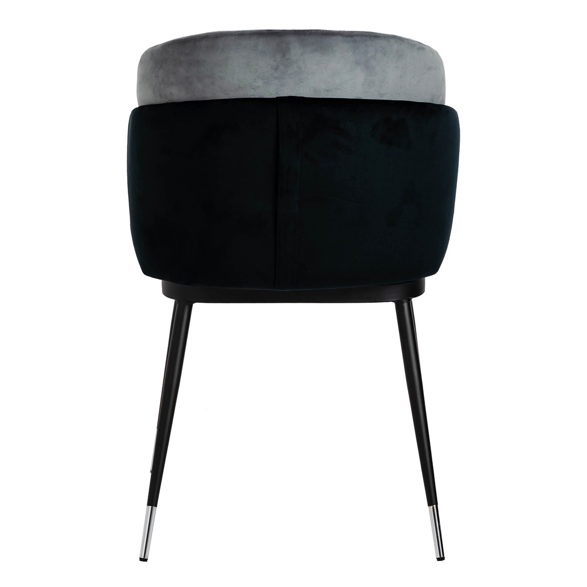 - Krzesło Marcel. Siedzisko i oparcie tapicerowane miękkim i przyjemnym w dotyku welurem. Siedzisko oraz część zewnętrzna oparcia w kolorze czarnym. Wewnętrzna strona oparcia jest w kolorze ciemny szary. Konstrukcja z metalu w kolorze czarnym, matowym. Deko