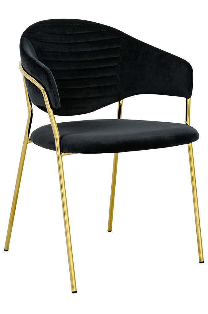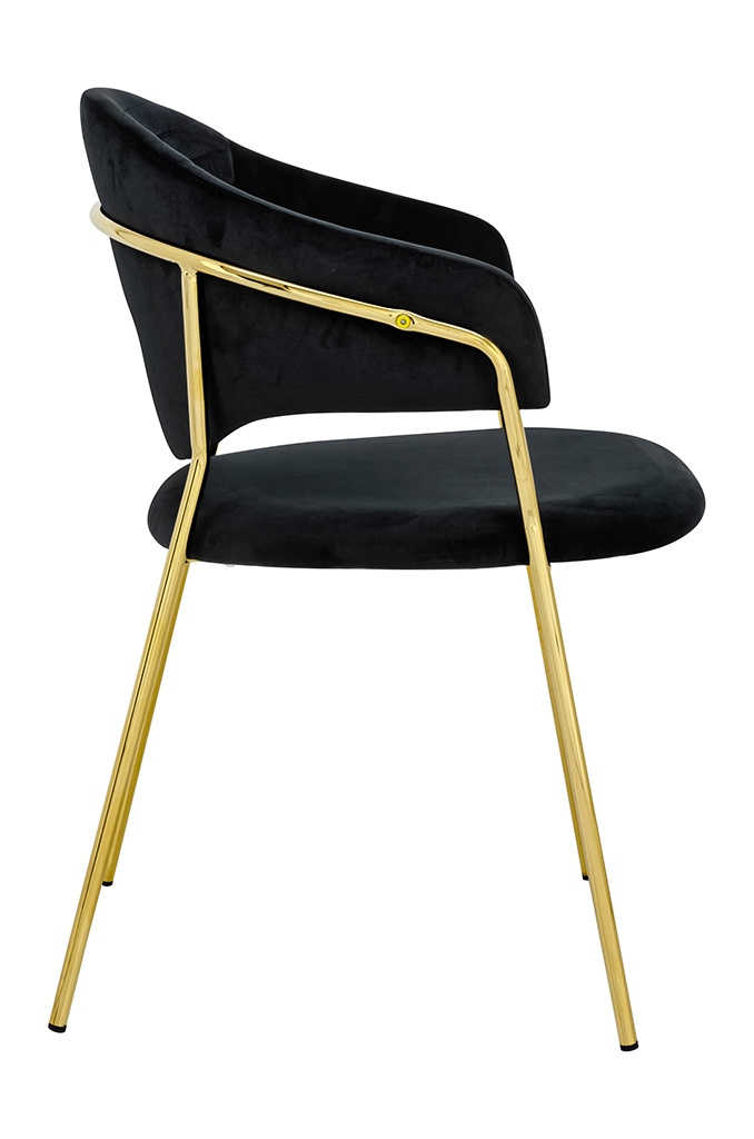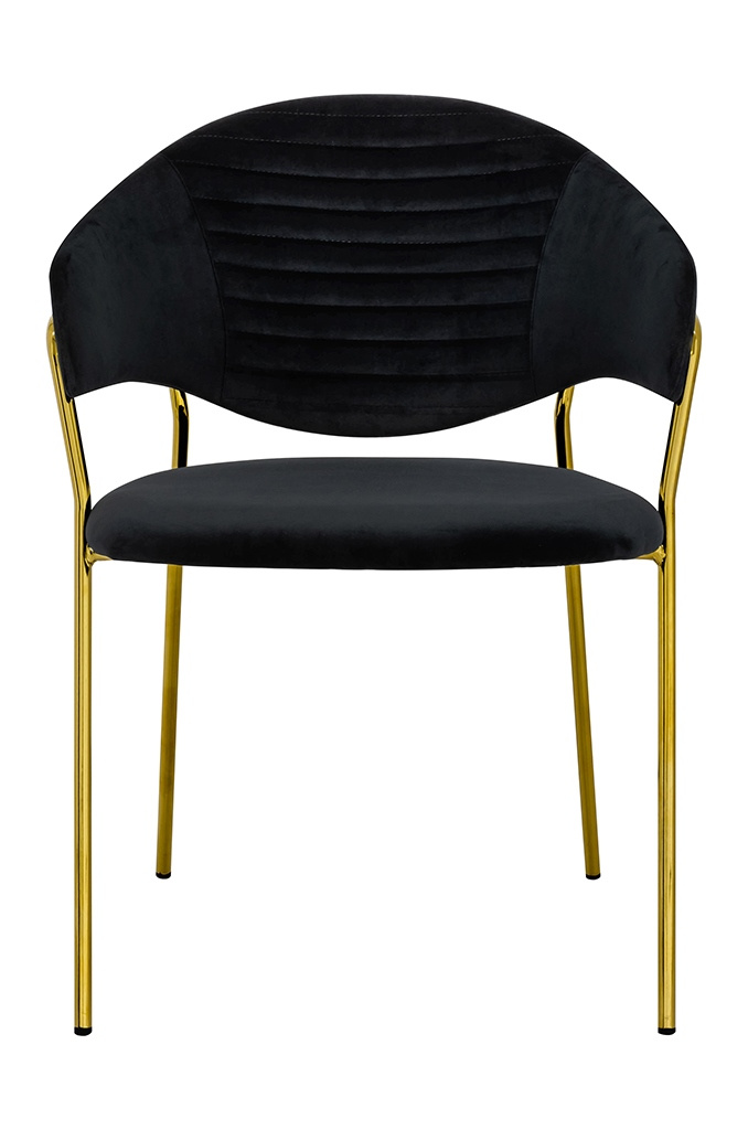- Krzesło Naomi w kolorze czarnym. Siedzisko i oparcie tapicerowane miękkim i przyjemnym w dotyku welurem. Konstrukcja z metalu w kolorze złotym. Naomi to doskonałe połączenie modnego weluru z elegancką podstawą. Elegancję podkreślają przeszycia na oparciu.