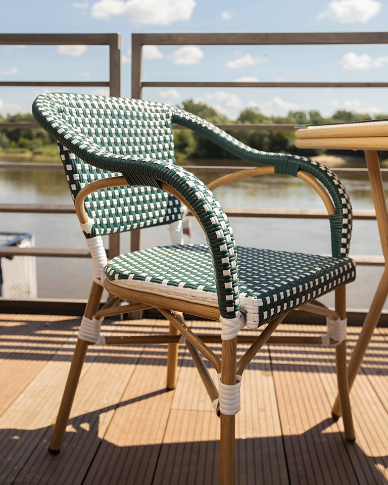 - Krzesło CAFE MIRAMAR turkus / morski rattan. Ponadczasowe, lekkie krzesło z podłokietnikami, które uzupełni zarówno Twoje wnętrze, jak i ogród. Zainspirowane stylem paryskich kawiarni. Może być stosowane do użytku wewnętrznego oraz zewnętrznego. Wygodne s