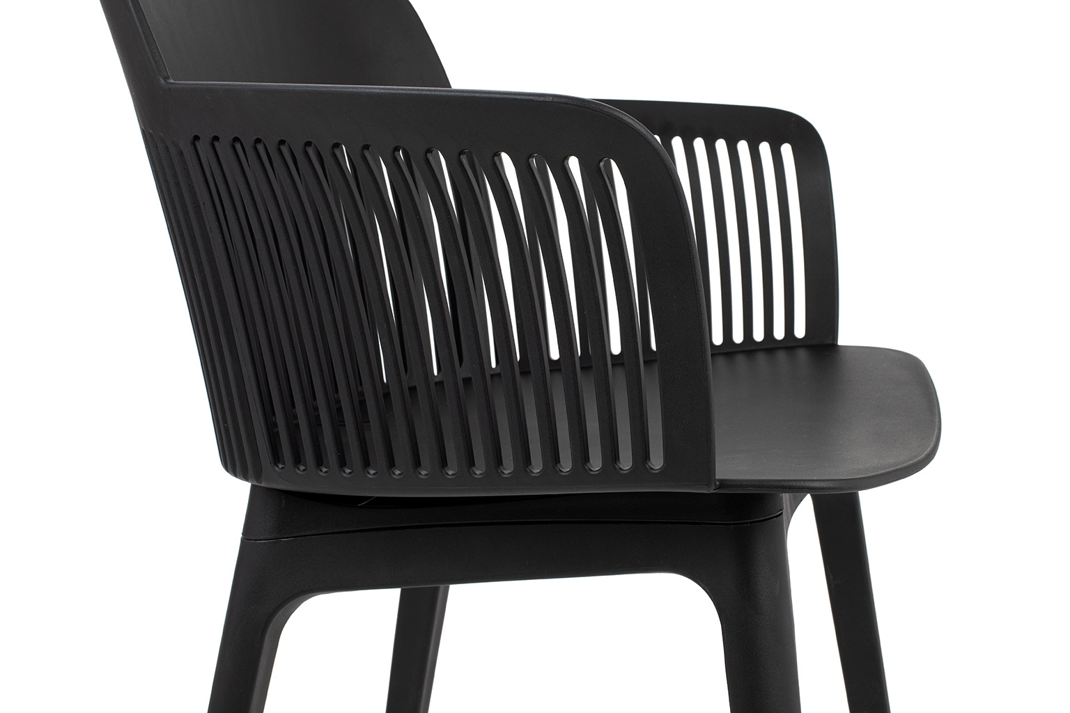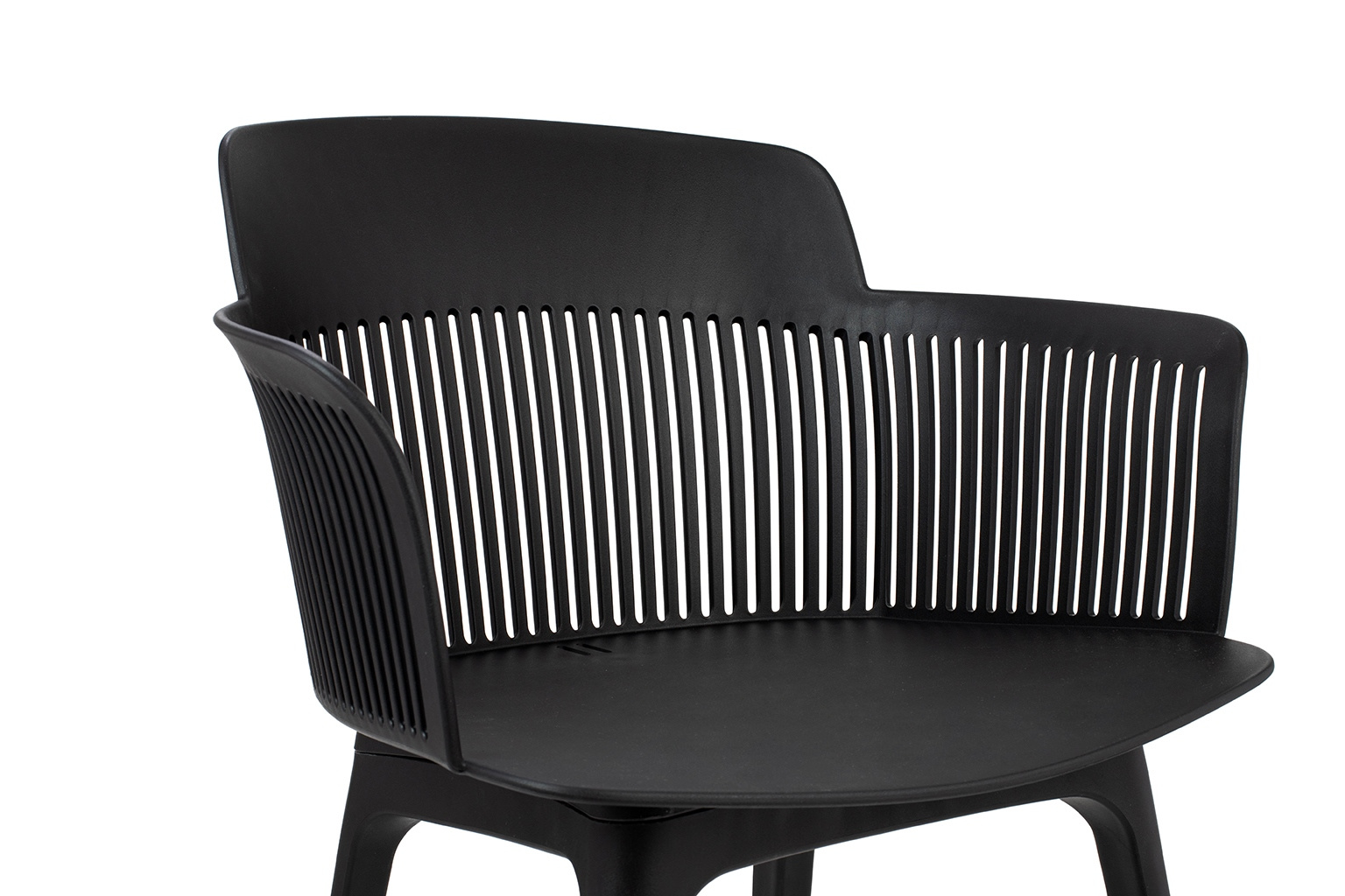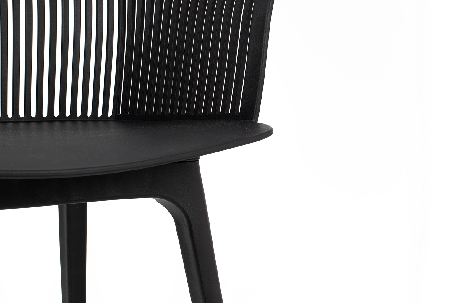 - Krzesło TORRE czarne. Siedzisko oraz podstawa wykonane zostały w całości z polipropylenu w kolorze czarnym matowym. Nowoczesnym elementem jest ażurowe oparcie, które nadaje krzesłu lekkości. Szerokie siedzisko oraz podłokietniki zapewniają odpowiedni komf