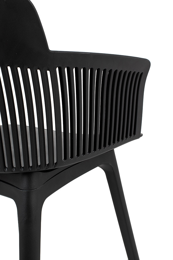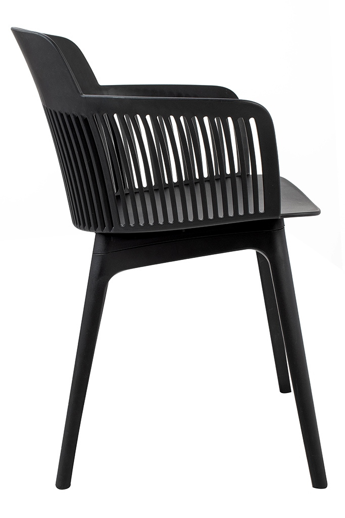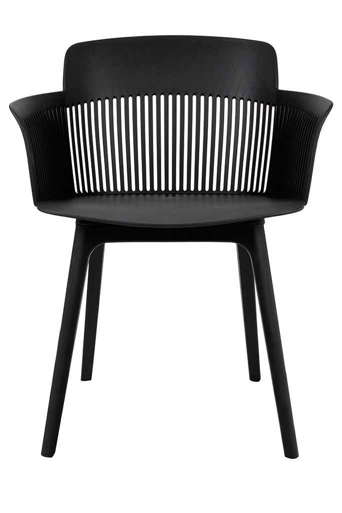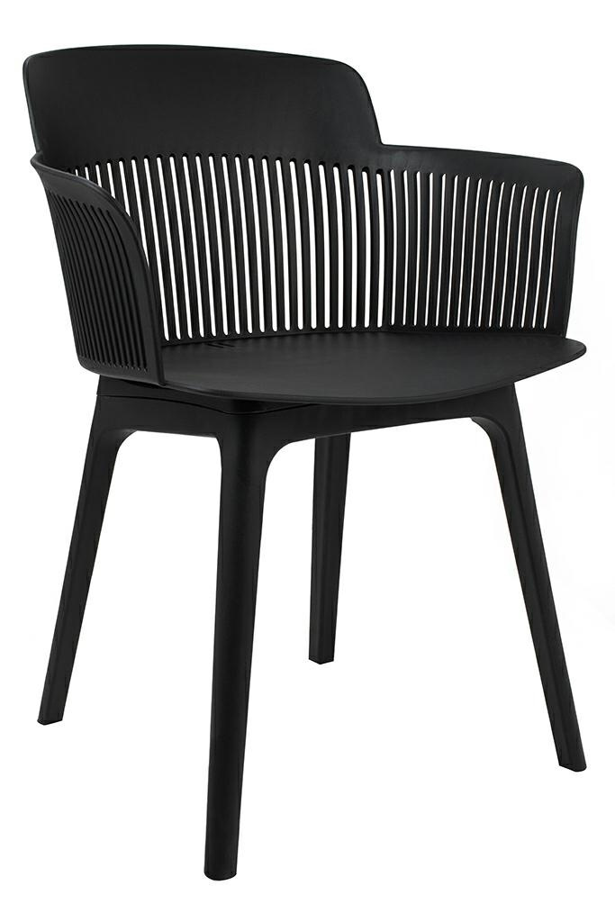 - Krzesło TORRE czarne. Siedzisko oraz podstawa wykonane zostały w całości z polipropylenu w kolorze czarnym matowym. Nowoczesnym elementem jest ażurowe oparcie, które nadaje krzesłu lekkości. Szerokie siedzisko oraz podłokietniki zapewniają odpowiedni komf