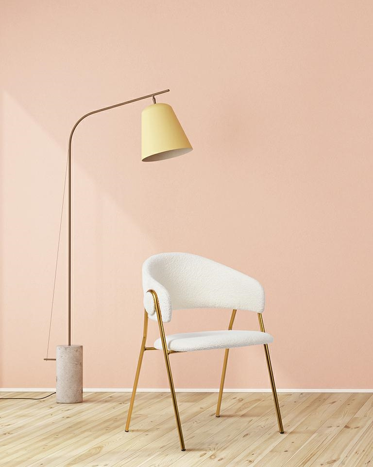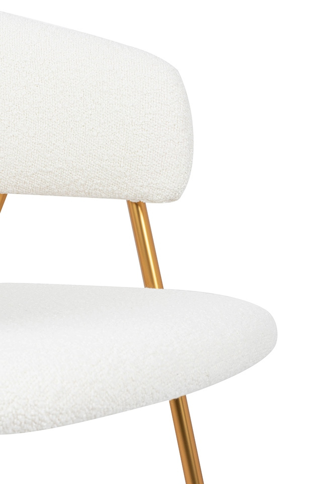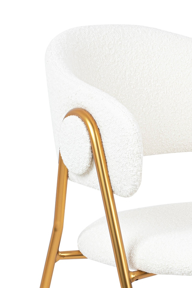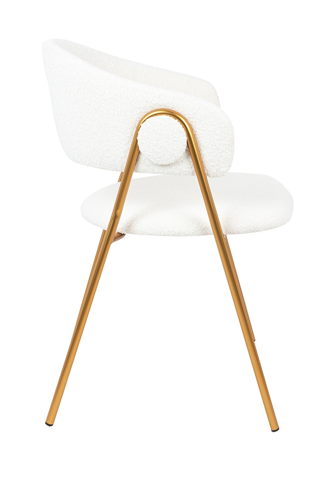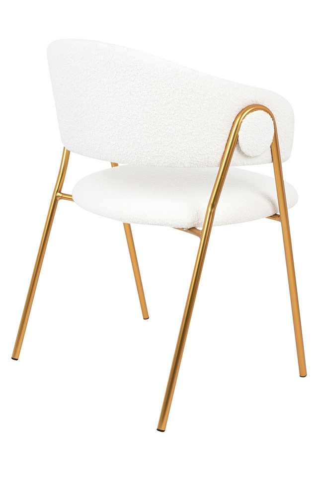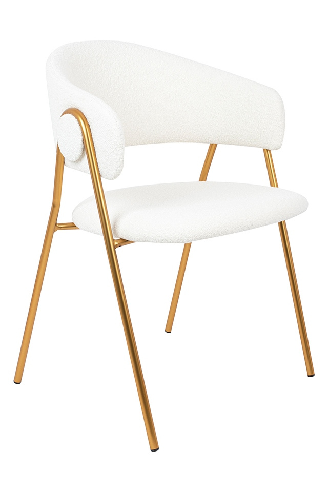 - Krzesło VERSO BOUCLE białe. Oparcie i siedzisko tapicerowane są przyjemną, miękką w dotyku tkaniną boucle w kolorze białym. Podstawa została wykonana z metalu lakierowanego na kolor satynowego złota. Podłokietniki z dekoracyjnym akcentem potęgują komfort