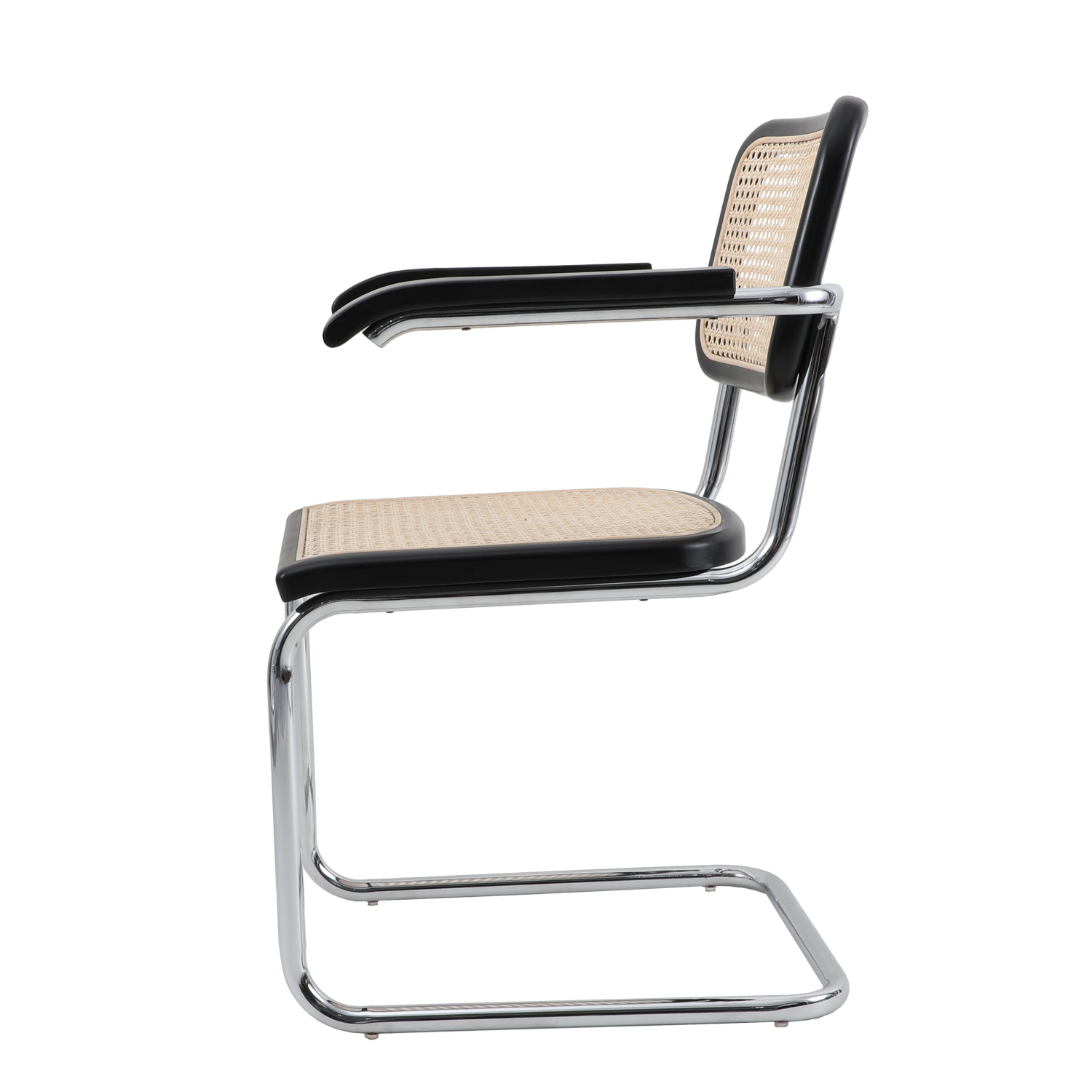 Krzesło VIENNA z podłokietnikami wykonane z naturalnego rattanu i czarnego drewna osadzone na stalowej chromowanej ramie.