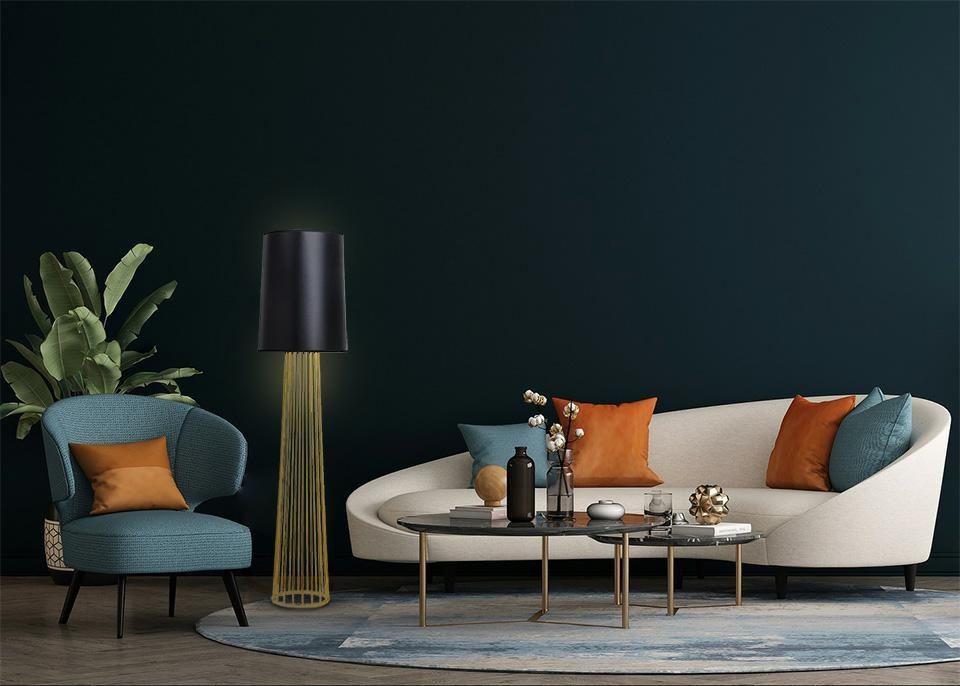- Lampa podłogowa Holmes Straight to propozycja dla osób ceniących elegancki wygląd w klasycznej formie. Lampa wykonana ze stali węglowej w kolorze złotym, błyszczącym. Czarny cylindryczny klosz wykonany został z płótna satynowego, usztywniony laminatem i w