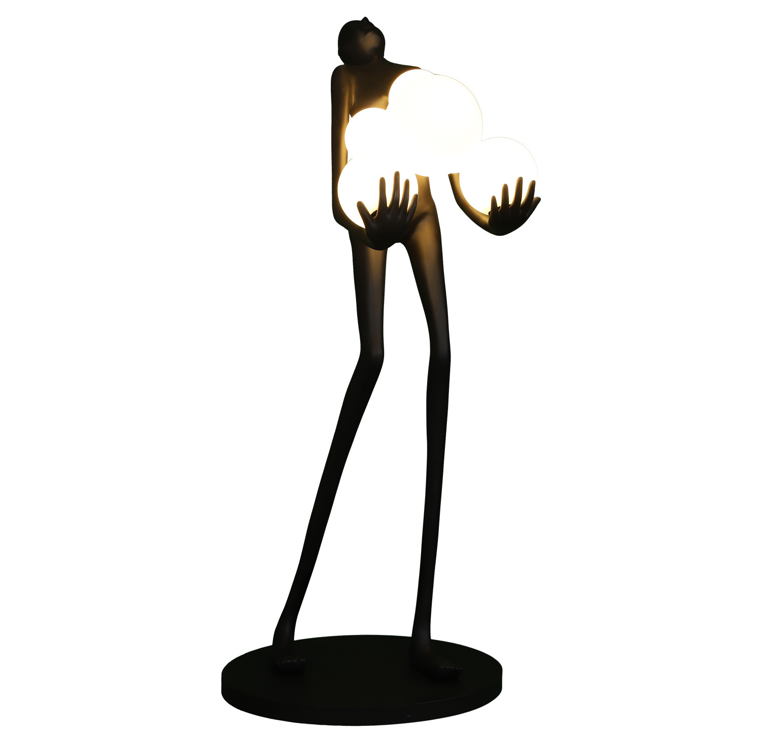 Niezwykle oryginalna lampa podłogowa WOMAN przedstawia kobiecą postać niosącą szklane kule w mlecznym kolorze.