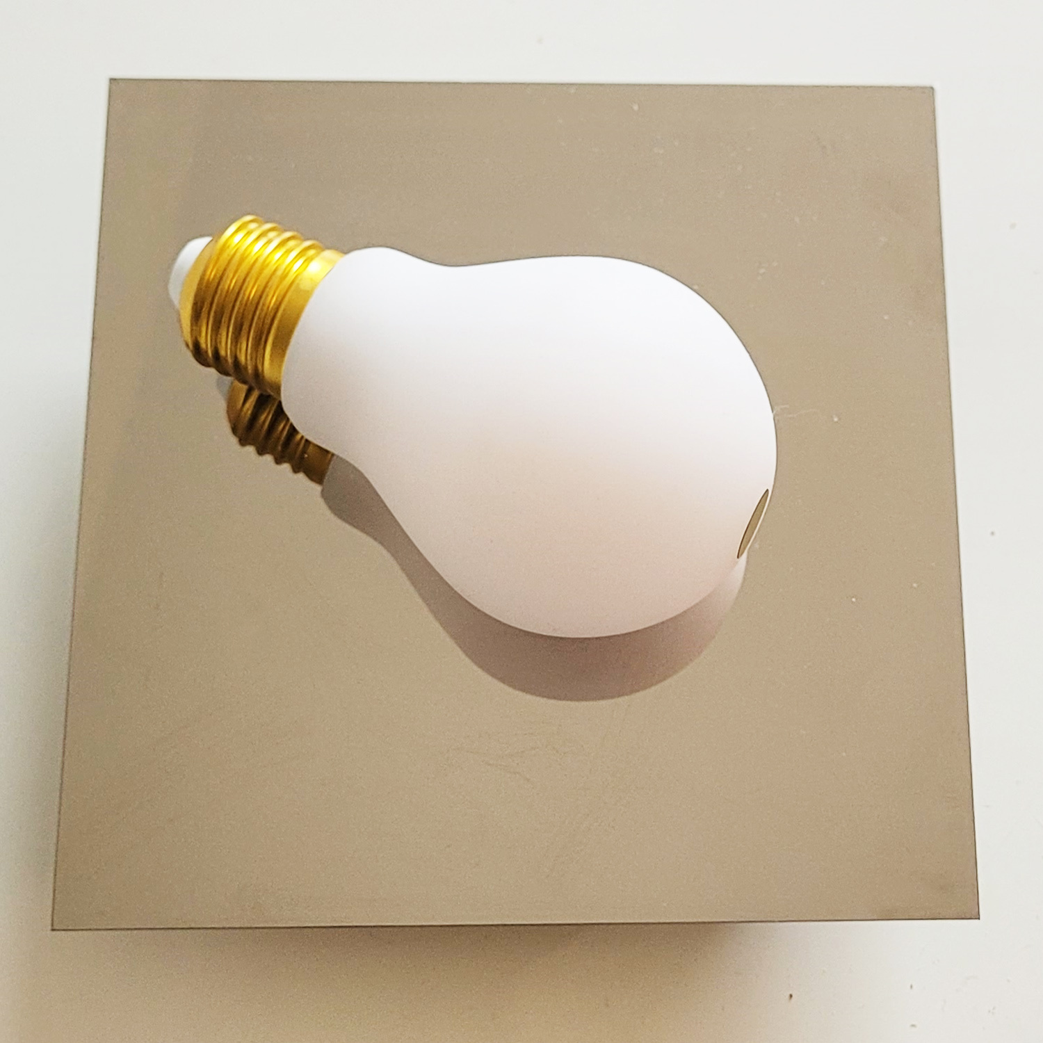 Biała żarówka o wymiarach 10 cm * 6 cm odbija się dekoracyjnie w lustrze podstawy.