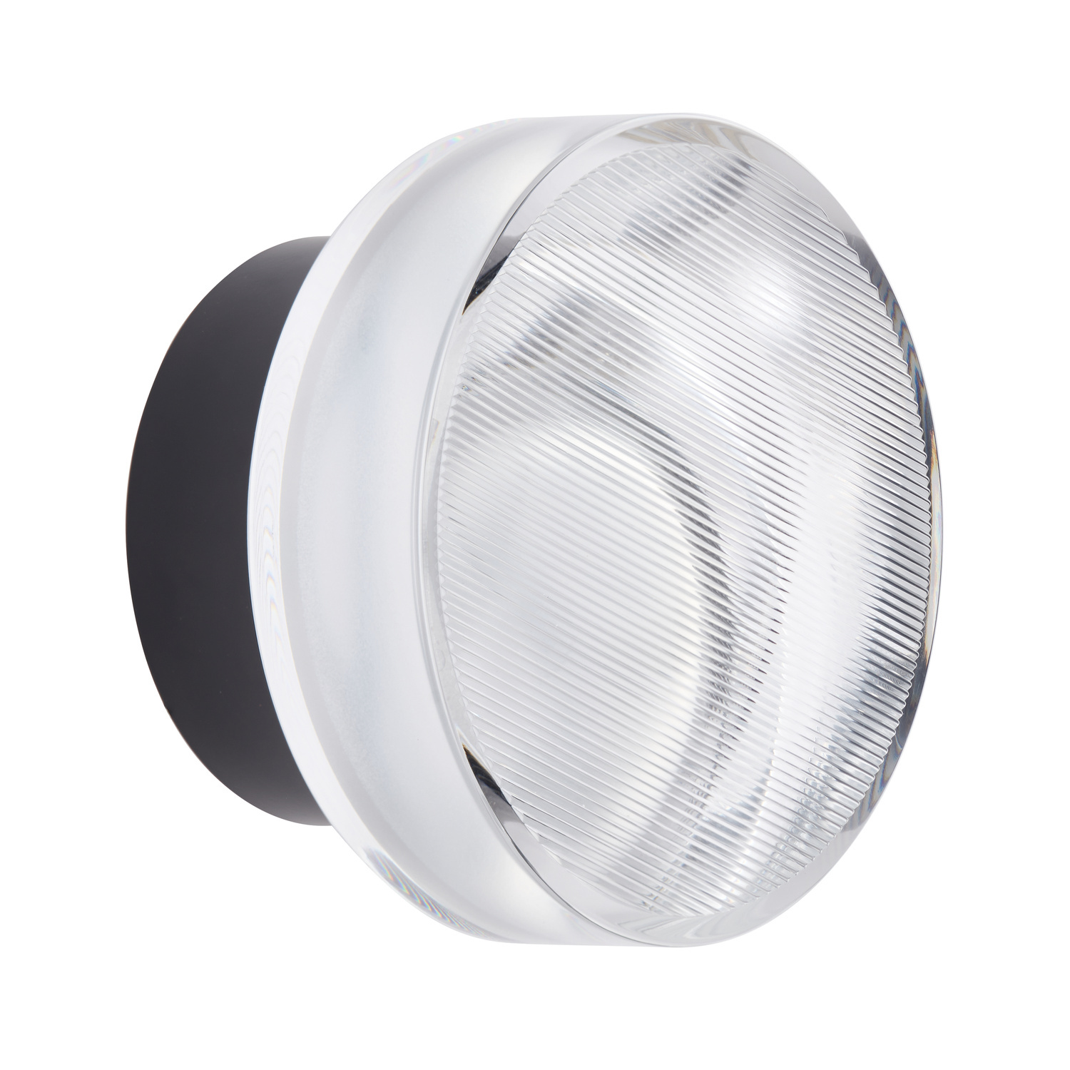 - Stylowy kinkiet ścienny z transparentnego, fakturowanego akrylu i czarnego wykończenia w metalu – idealne oświetlenie akcentowe eleganckich wnętrz. Niewielki plafon sufitowy.