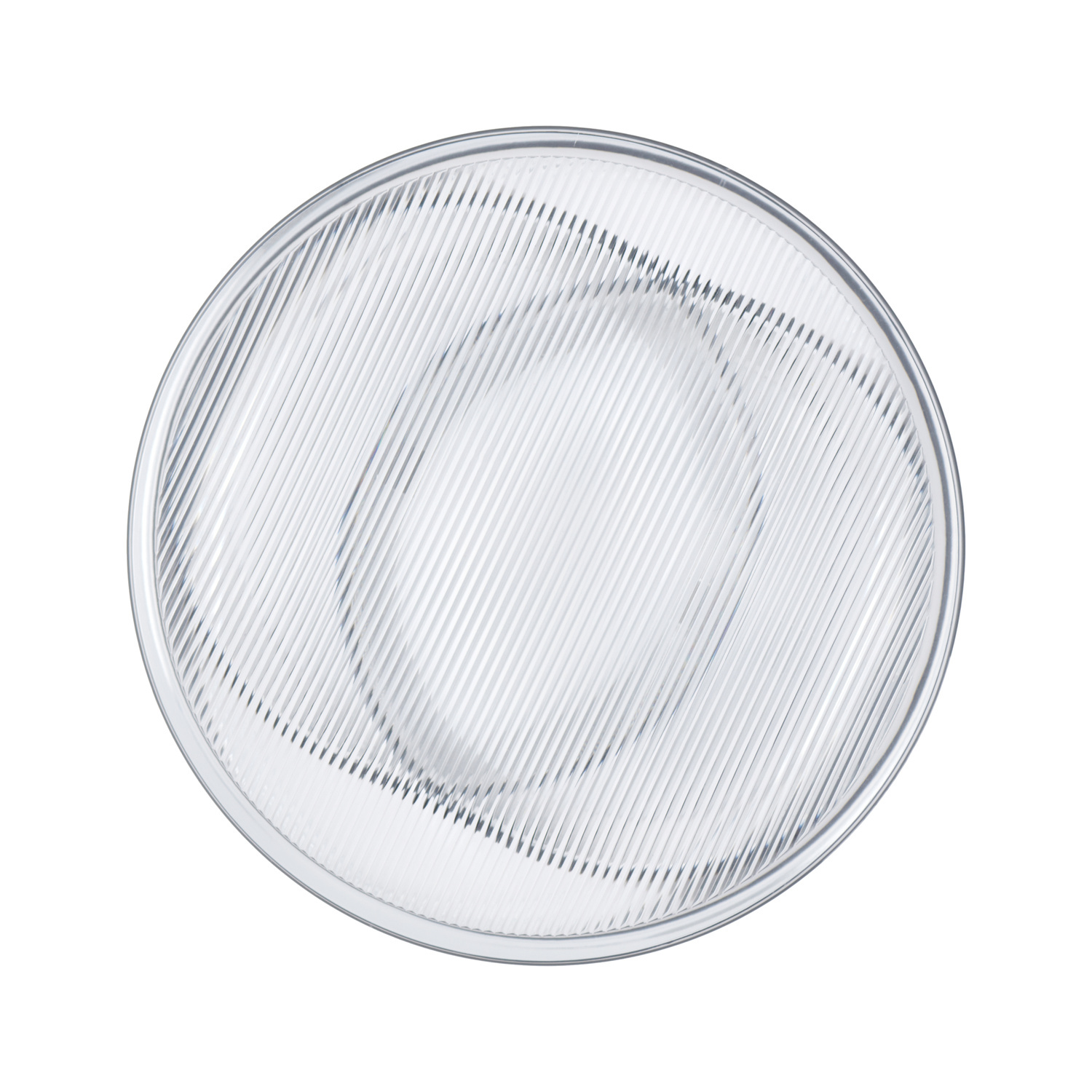 Okrągły klosz wykonany jest z przezroczystego akrylu o unikalnej, fakturowanej powierzchni.