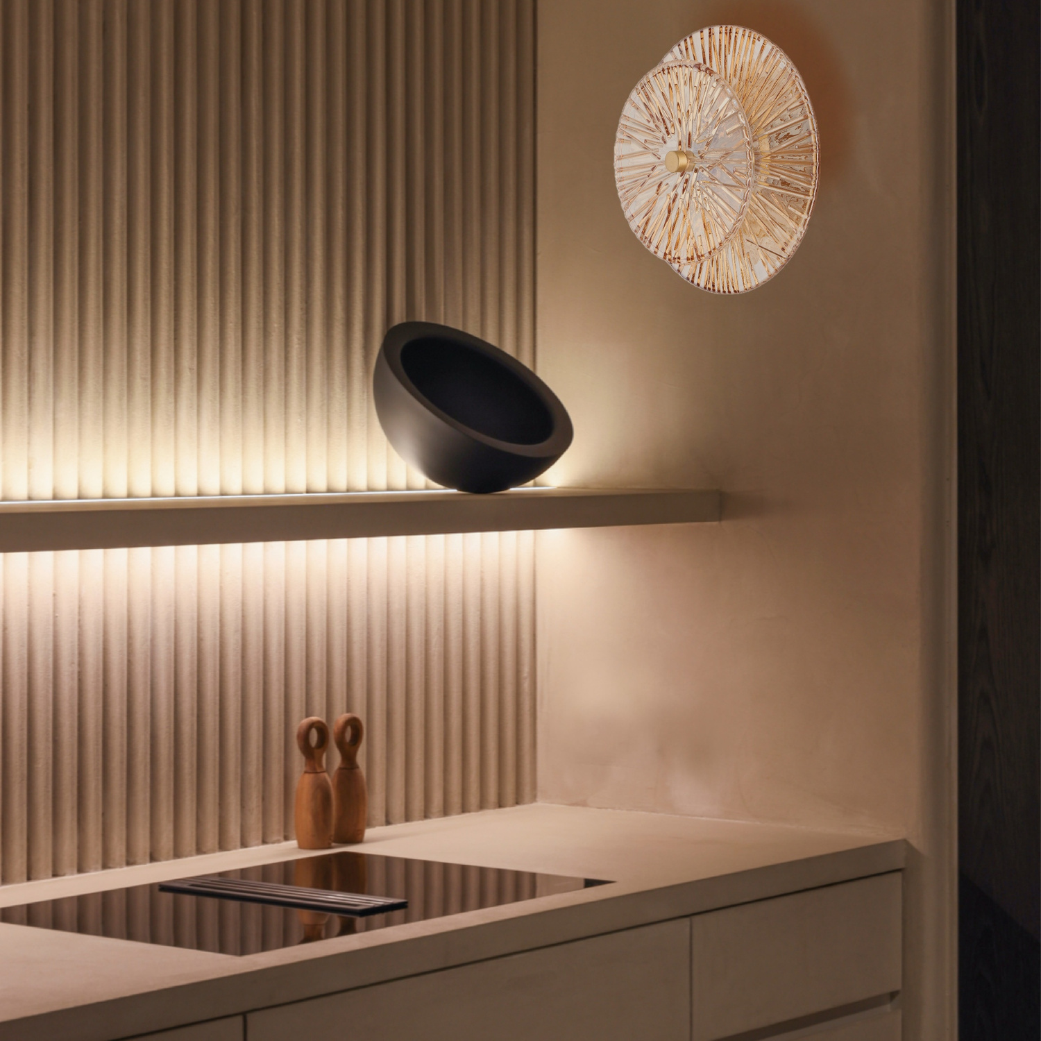 Dzięki szklanej powierzchni lampa nabiera lekkości wyrazu, wypełniając przestrzeń ciepłym światłem.