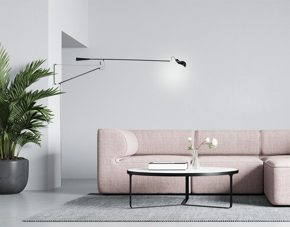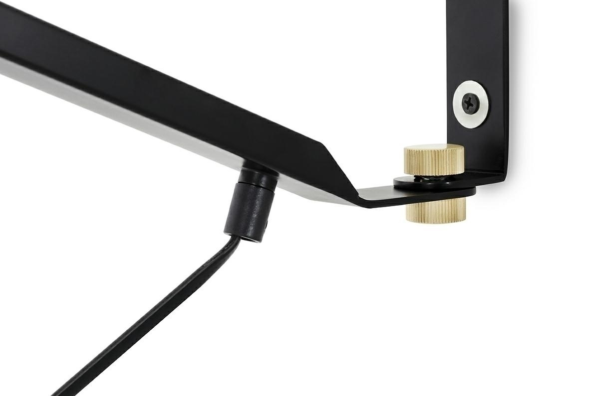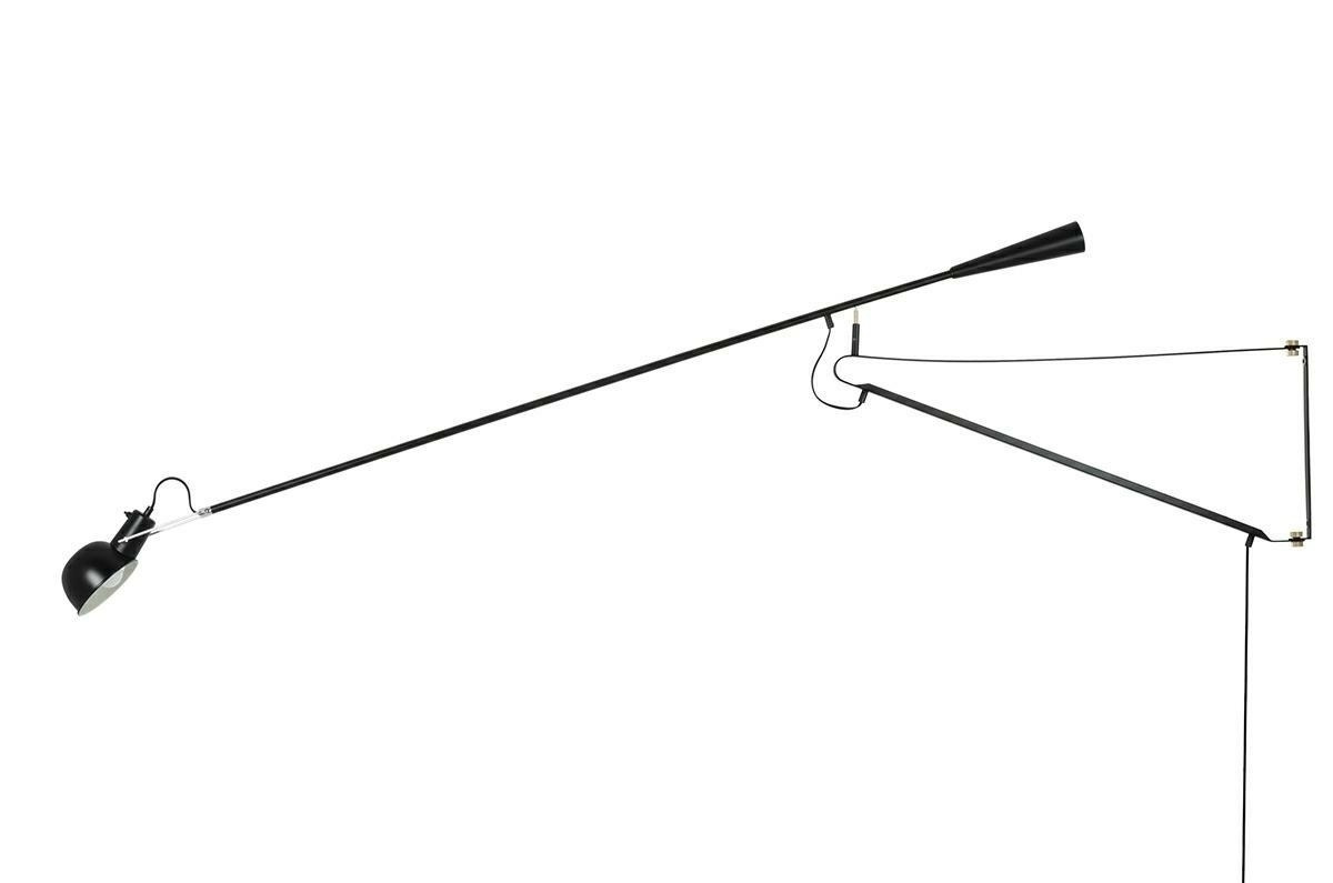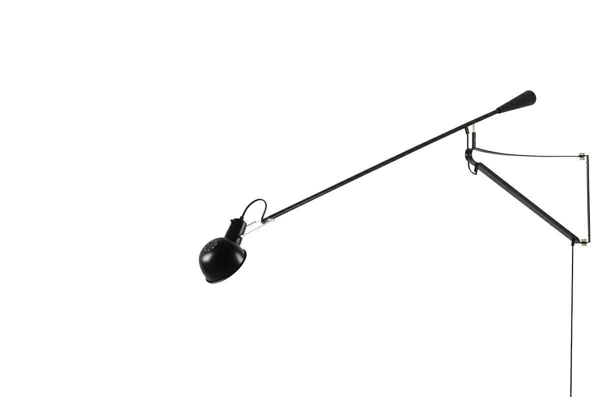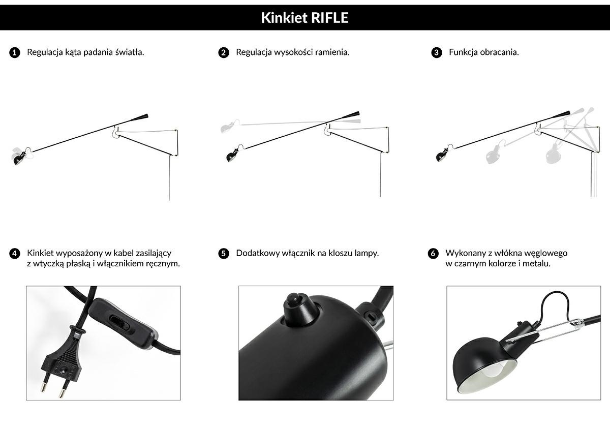 - Lampa ścienna RIFLE czarna. W całości została wykonana z włókna węglowego w kolorze czarnym. Długie ramię z regulacją wysokości oraz możliwością obracania, zapewnia odpowiednie oświetlenie pomieszczenia. Kinkiet można włączyć zarówno przełącznikiem na prz