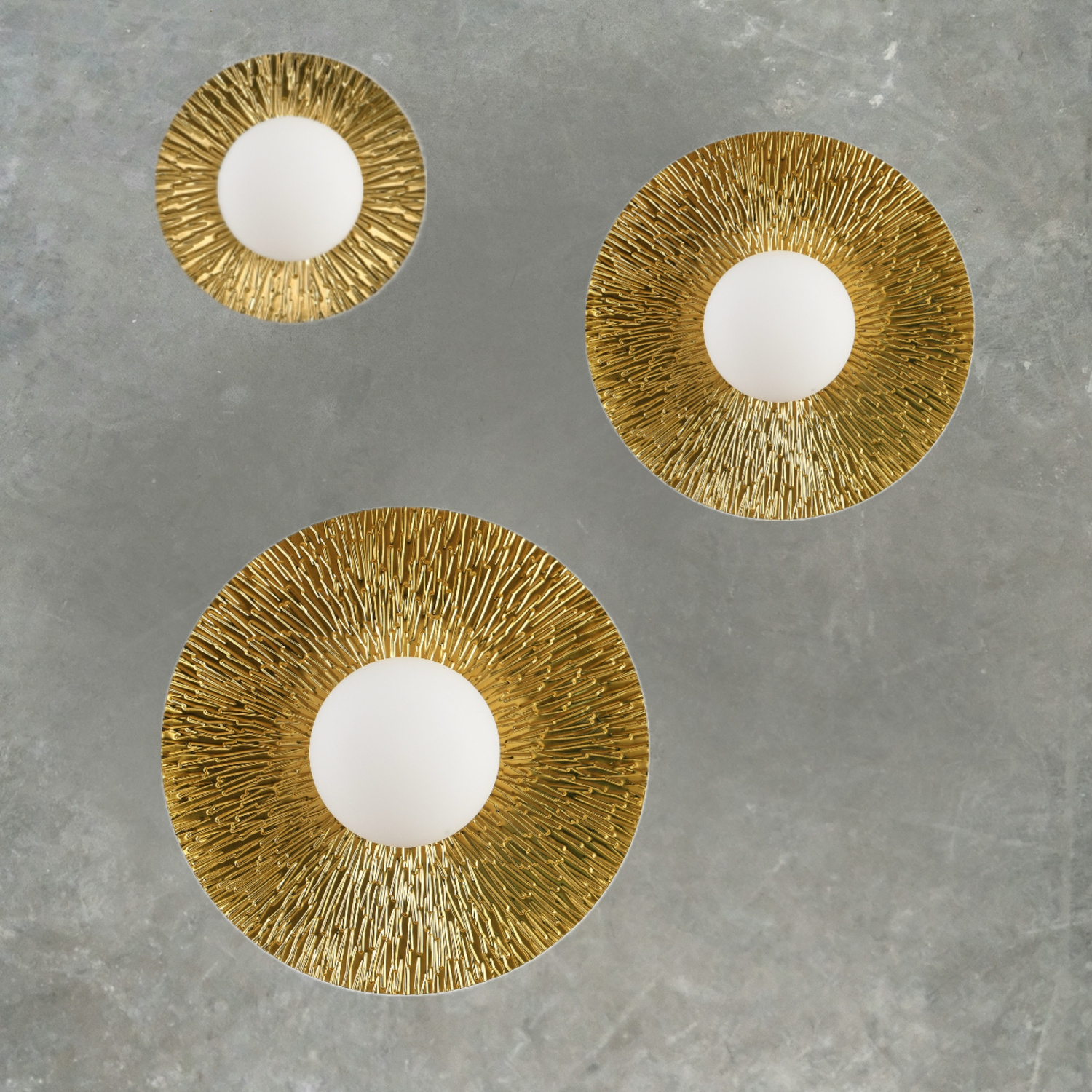 Złoty Kinkiet SUN ma formę okręgu, z centralnie umieszczonym, okrągłym otworem na źródło światła