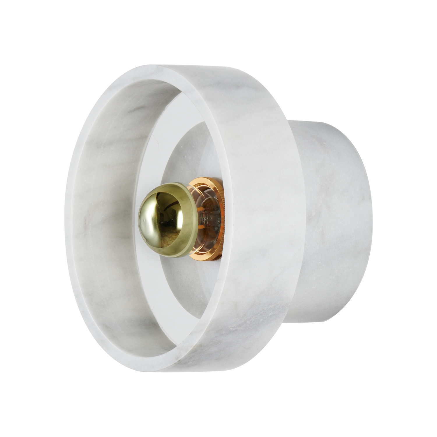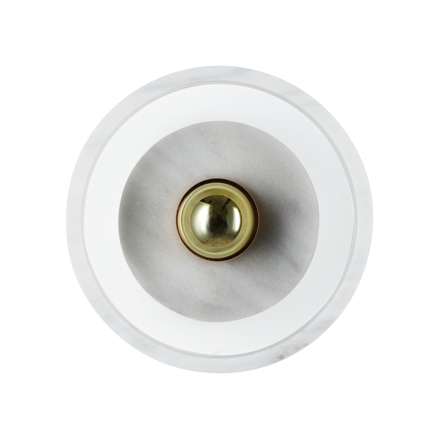 Elegancji kinkiet UNIVERSO wykonany został z białego marmuru połączonego z aluminiowym dekoracyjnym elementem w kolorze złota oraz szklaną taflą.
