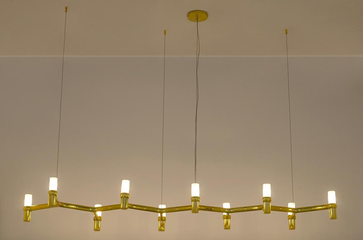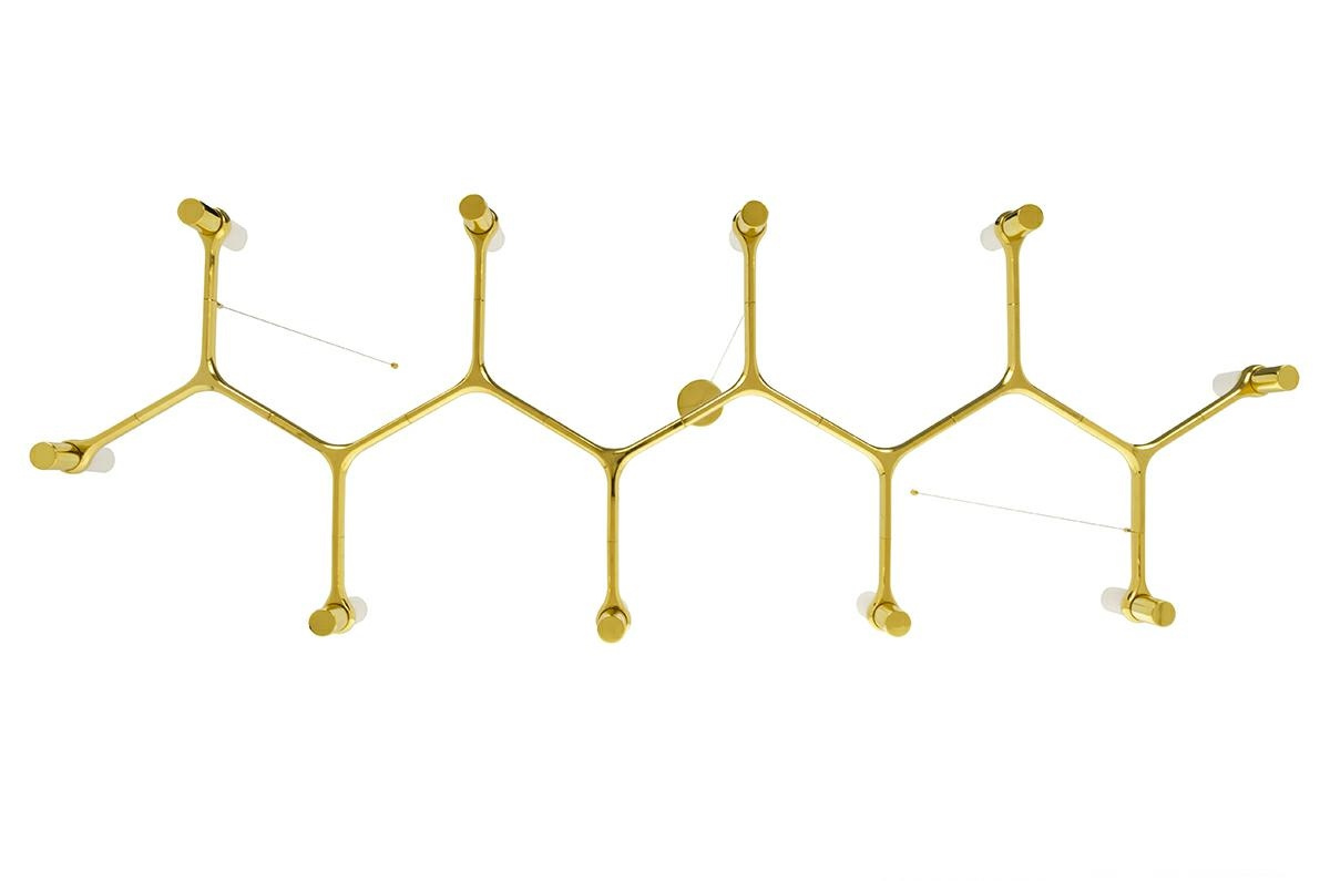 - Lampa wisząca Atomic Long. Designerska konstrukcja została wykonana z metalu w kolorze złotym z błyszczącym wykończeniem. Całość zawieszona jest na stalowych linkach oraz metalowej podsufitce. Atomic Long doskonale sprawdzi się nowoczesnych wnętrzach. Świ