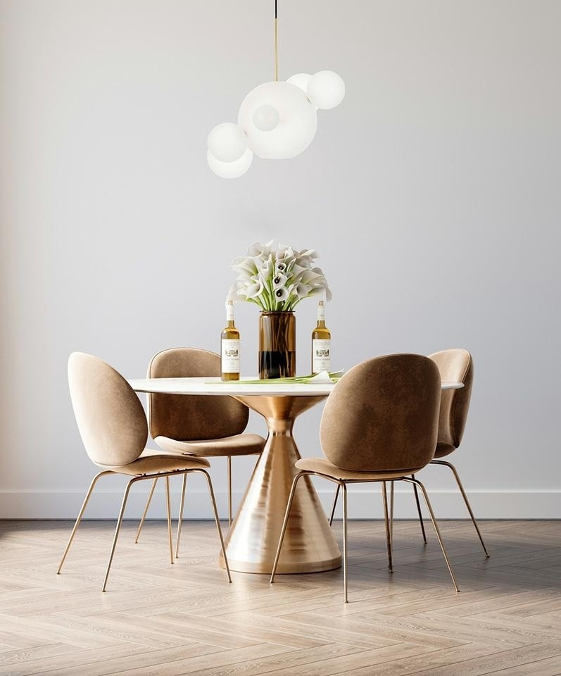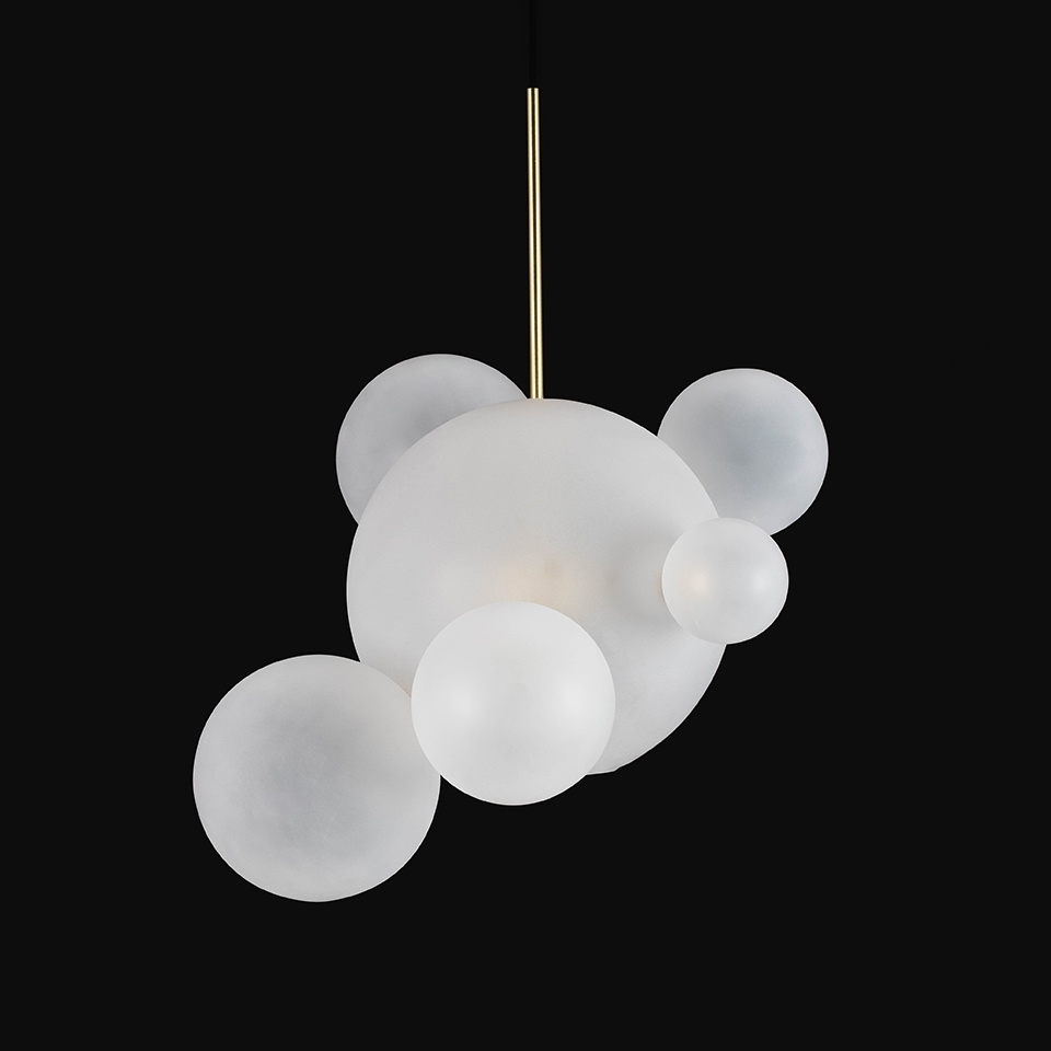 - Lampa Capri 6 składa się ze szklanych, mlecznych kloszy oraz anodowanego aluminium. Główna kula zawieszona jest na delikatnym przewodzie. Wewnątrz kuli jest złoty, szczotkowany pręt zakończony źródłem światła LED. Całość przypomina połączone bańki mydlane