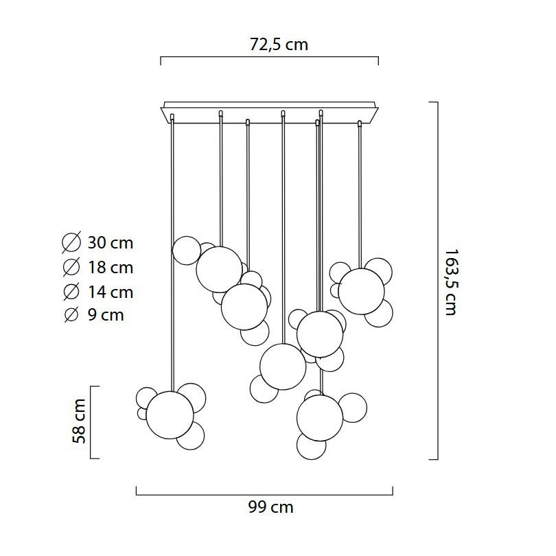 Siedem głównych kul zawieszonych zostało na przewodach, wychodzących z jednej podsufitki.