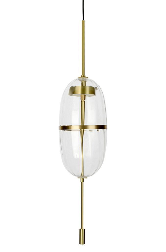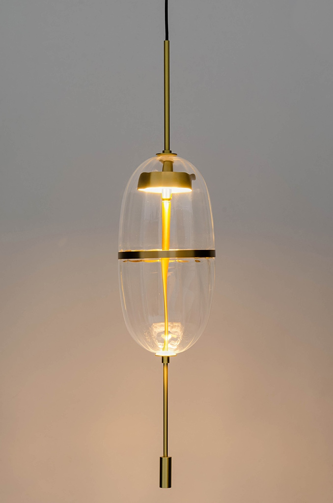 - Lampa Chaplin 200 to połączenie szklanego klosza oraz mosiądzu. Klosz w kształcie elipsy, zawieszony jest na czarnym przewodzie. Wewnątrz klosza znajduje się pręt z umieszczonym w górnej części, źródłem światła LED. Snop światła o ciepłej barwie skierowan