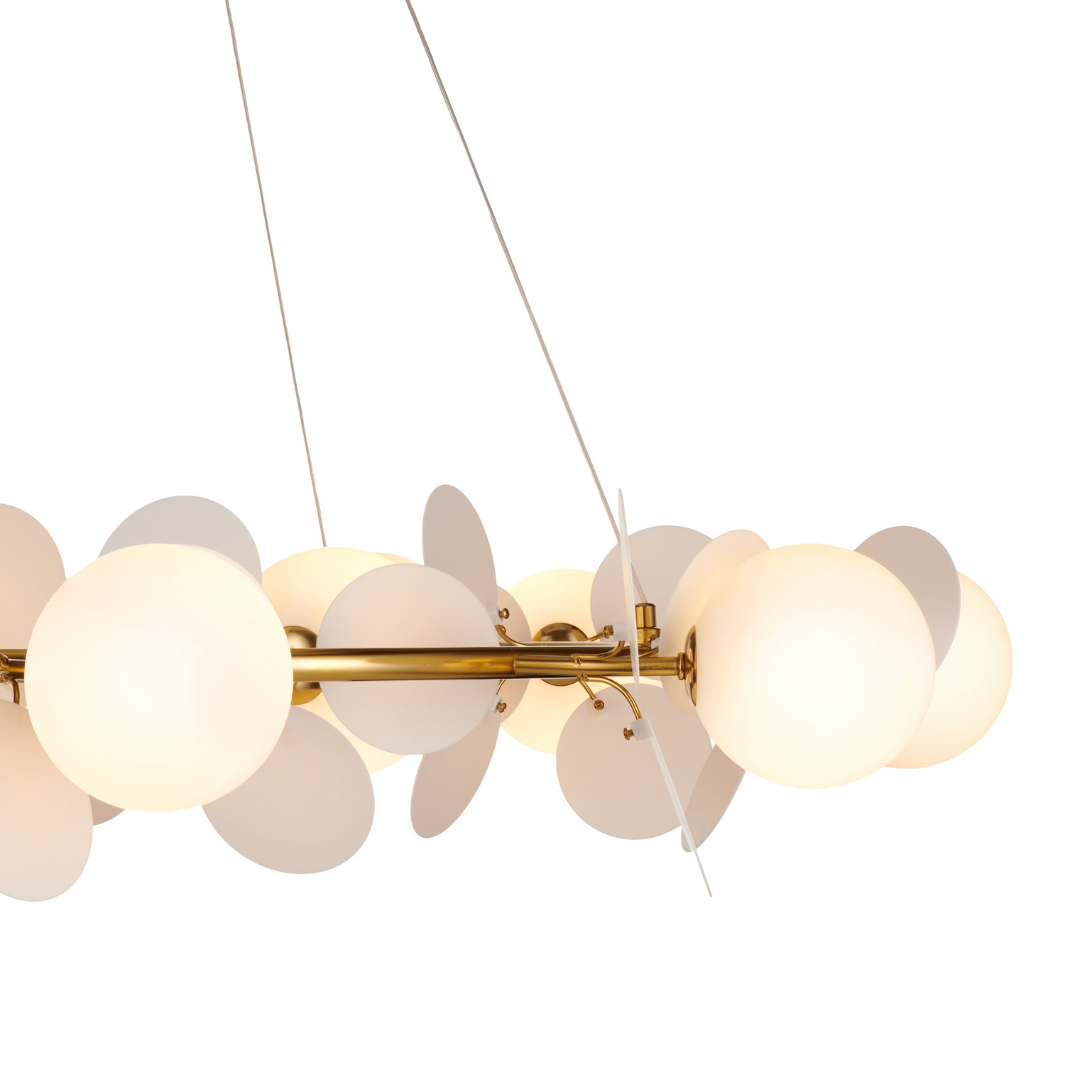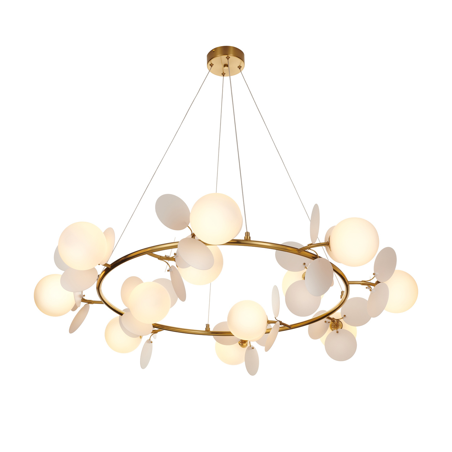 - Nowoczesny żyrandol z złotą okrągłą obręczą, białymi kulistymi kloszami i białymi płatkami. Elegancki design, idealny do nowoczesnych wnętrz.