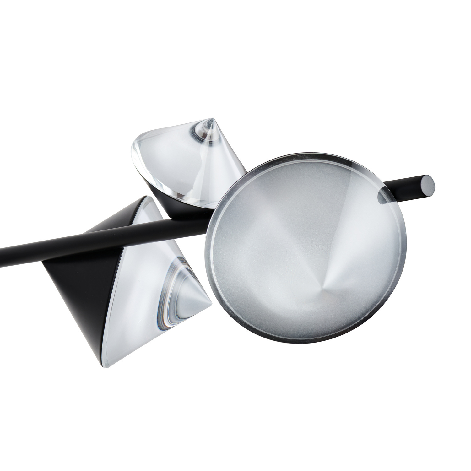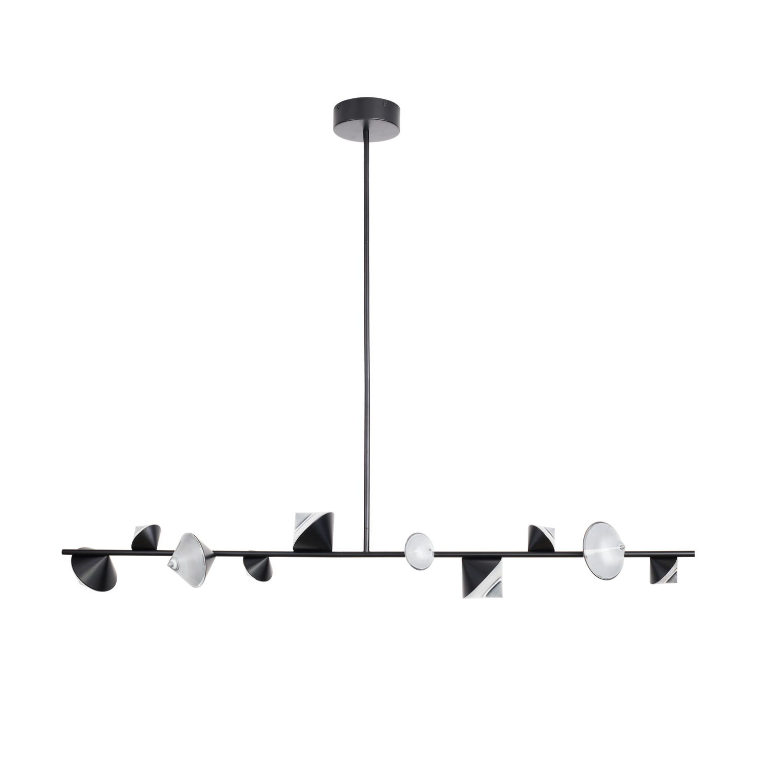 Klosze w kształcie stożka są rozmieszczone po przeciwnych stronach stelaża, nadając oprawie niezwykle dekoracyjny wygląd.