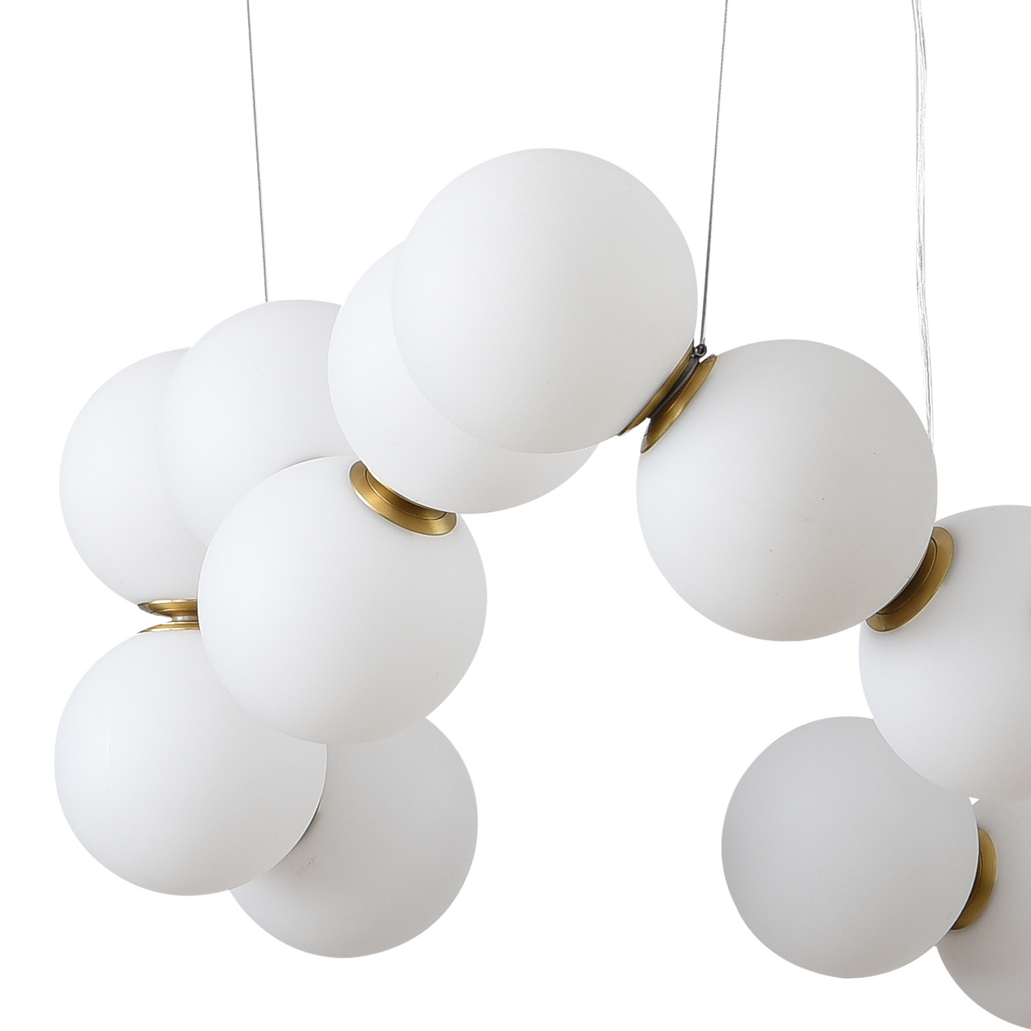Konstrukcja wykonana jest z mlecznych kul ułożonych w nieregularny okrąg, przypominający organiczną formę,