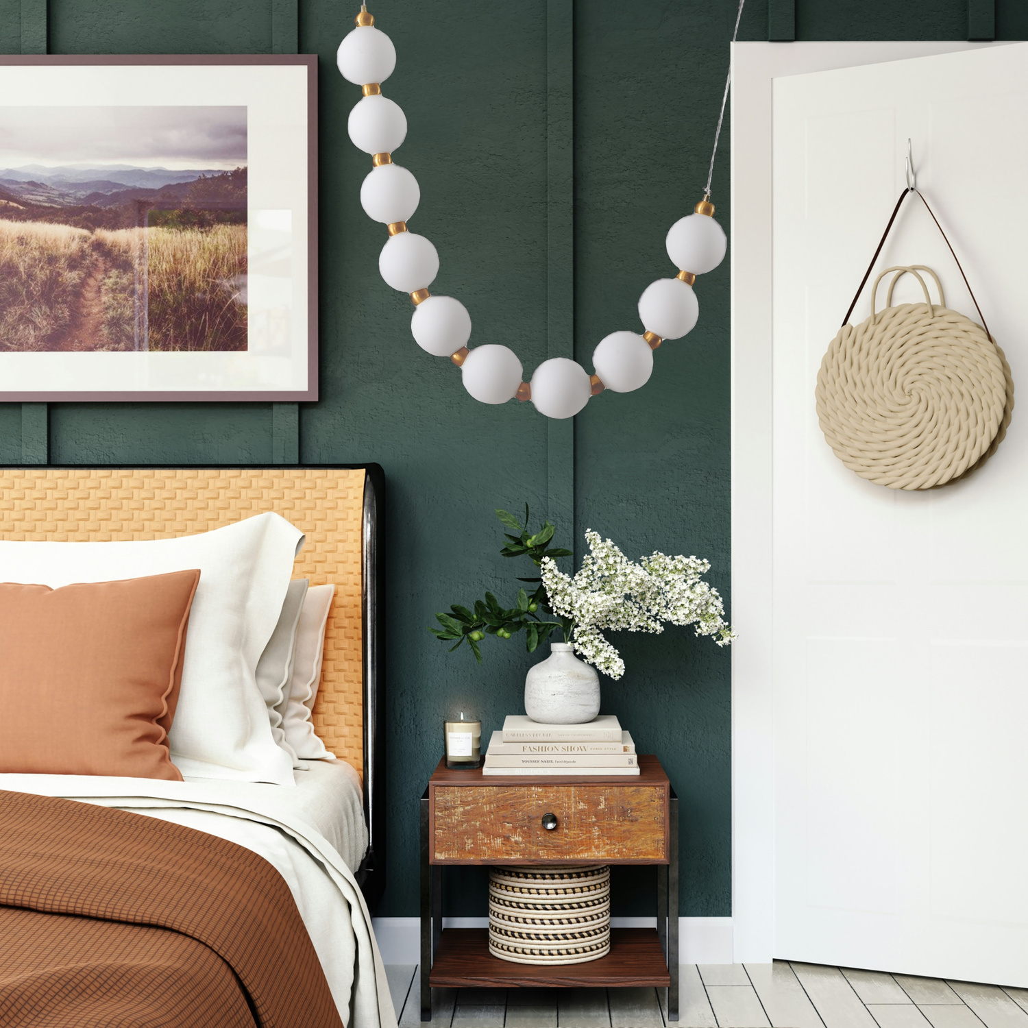 - Elegancka lampa ledowa o kształcie przypominającym perłowy naszyjnik.