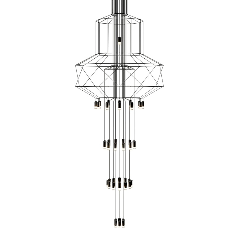 - Lampa FLUSSO 43 w kolorze czarnym, została wykonana z przewodów osadzonych na stalowych prętach, które poprzez zagięcia nadają oprawie wyjątkowy kształt. Metalowe klosze skrywające źródło światła wykończone są szkłem satynowym. Geometria w połączeniu z pr