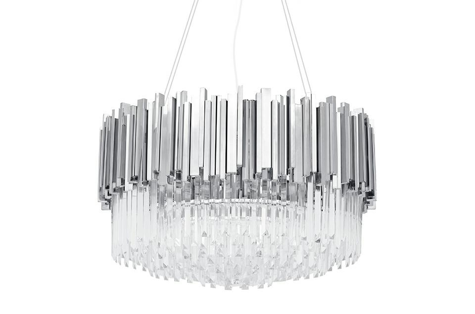 - Lampa wisząca Imperial Silver 60. Elegancka osłona klosza wykonana została ze stali szczotkowanej w srebrnym kolorze. Wewnątrz zawieszone są kryształki, które skrywają źródło światła. Całość zamocowana jest na podsufitce. Okrągły kształt lampy, połączenie