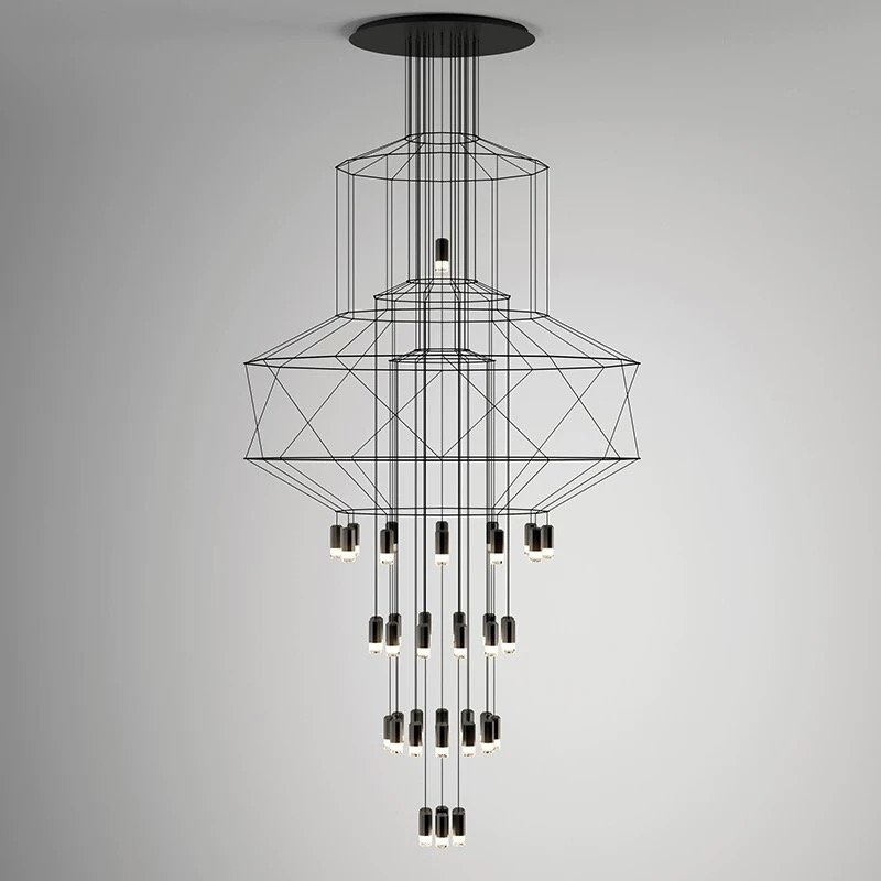 Lampa LINEA-43-XL zasilana jest czterdziestoma trzema przewodami świetlnymi zakończonymi kloszami ze szkła satynowego.