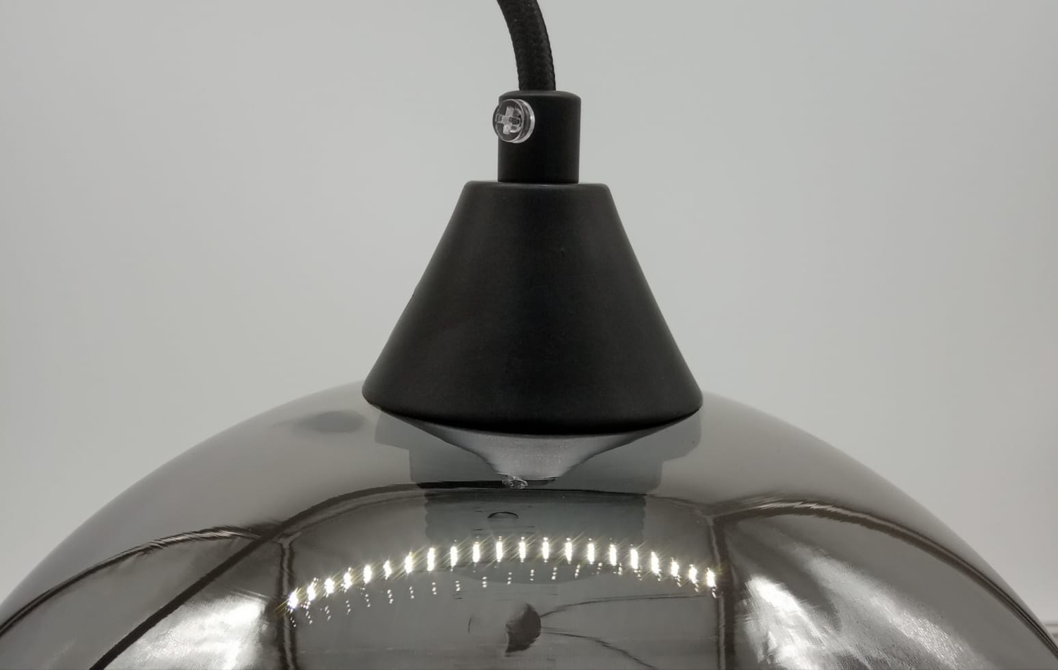 Szklany klosz w szarym kolorze jest półprzezroczysty, dzięki temu uwydatnione jest źródło światła.