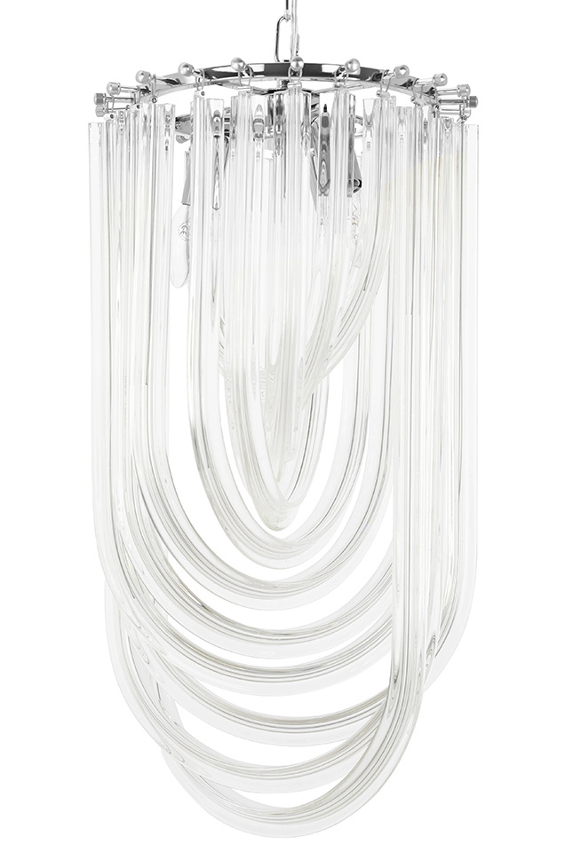 - Murano L to niezwykła lampa wisząca. Została wykonana ze szklanych kloszy, które niczym warkocze oplatają ukryte wewnątrz źródło światła. Każdy klosz mocowany jest do metalowej obręczy w kolorze srebrnym, tworząc wyjątkowo elegancką kompozycję. Całość zaw