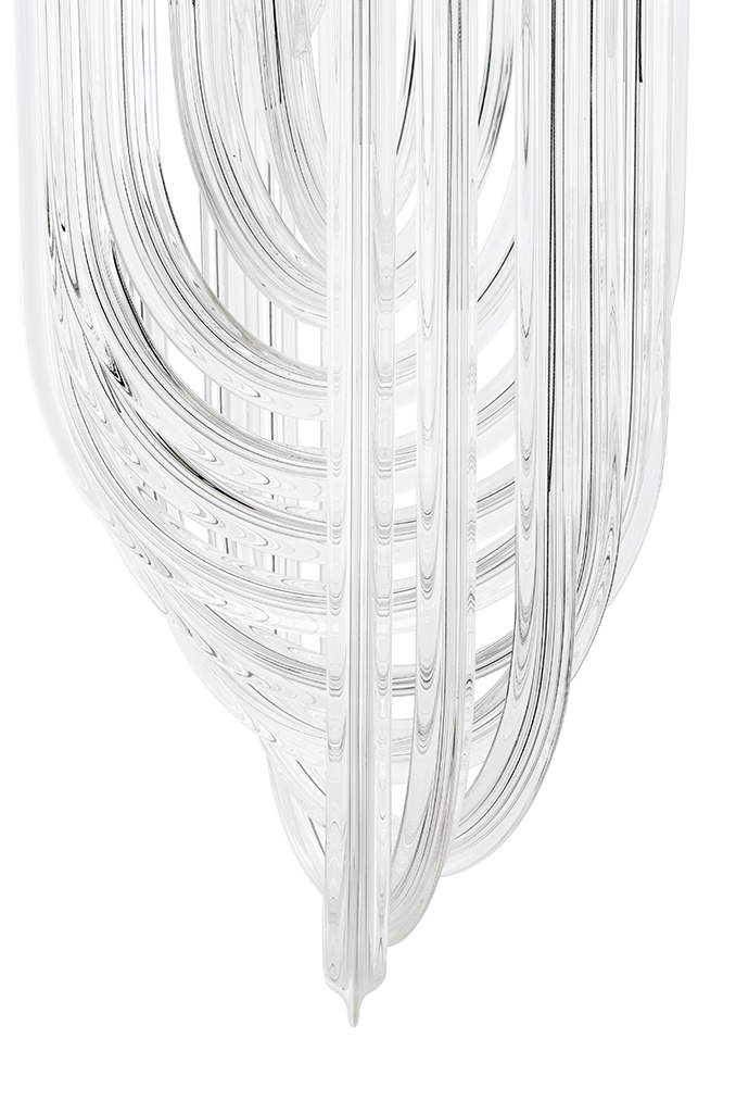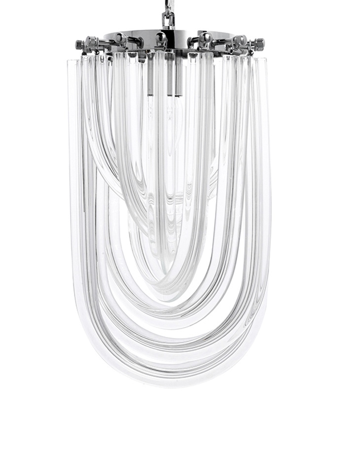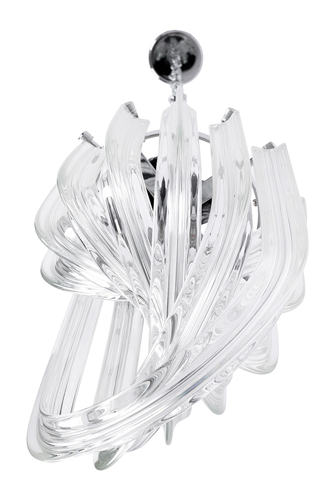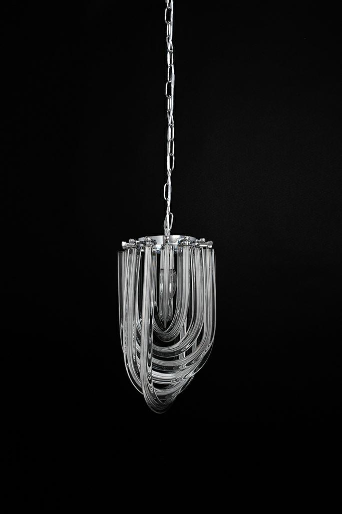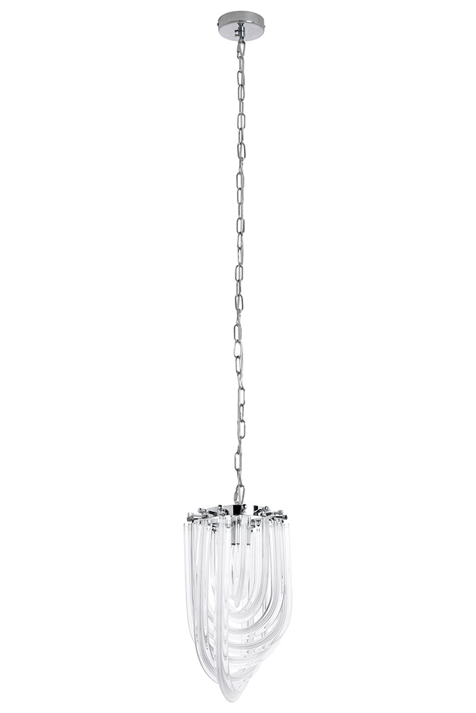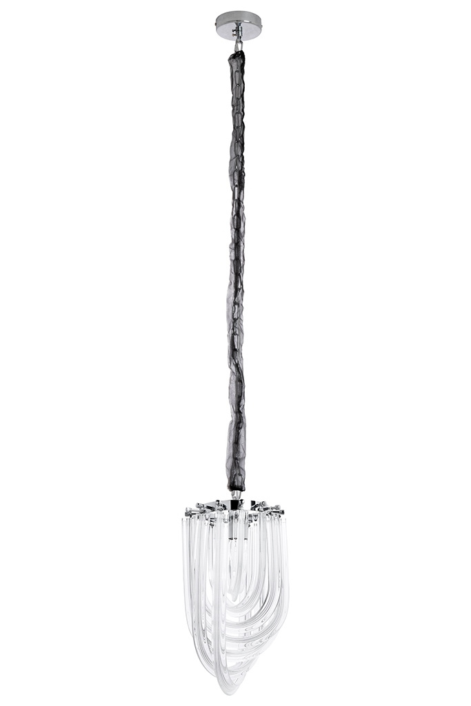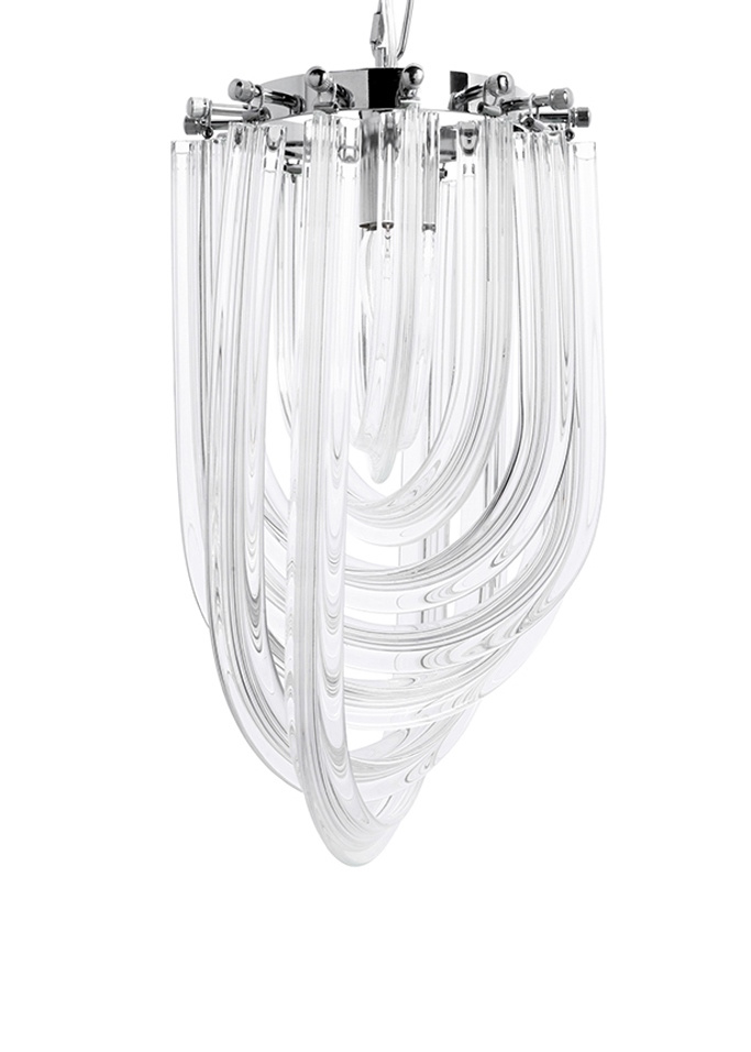 - Murano S to niezwykła lampa wisząca. Została wykonana ze szklanych kloszy, które niczym warkocze oplatają ukryte wewnątrz źródło światła. Każdy klosz mocowany jest do metalowej obręczy w kolorze srebrnym, tworząc wyjątkowo elegancką kompozycję. Całość zaw