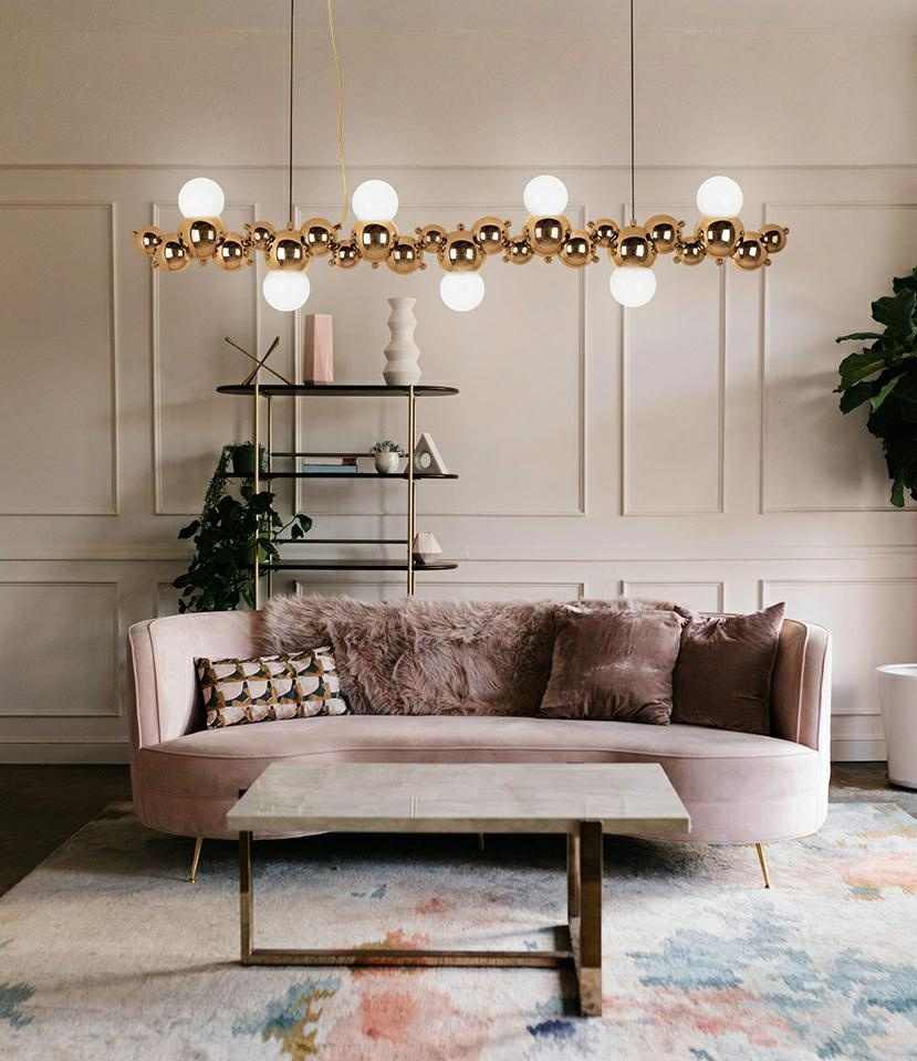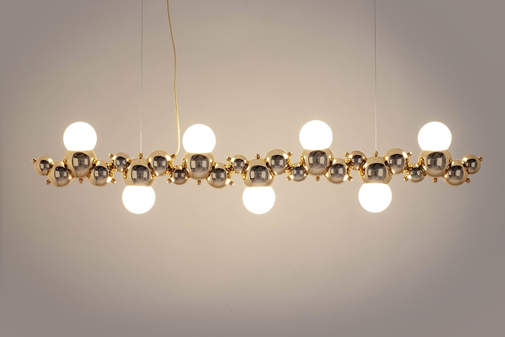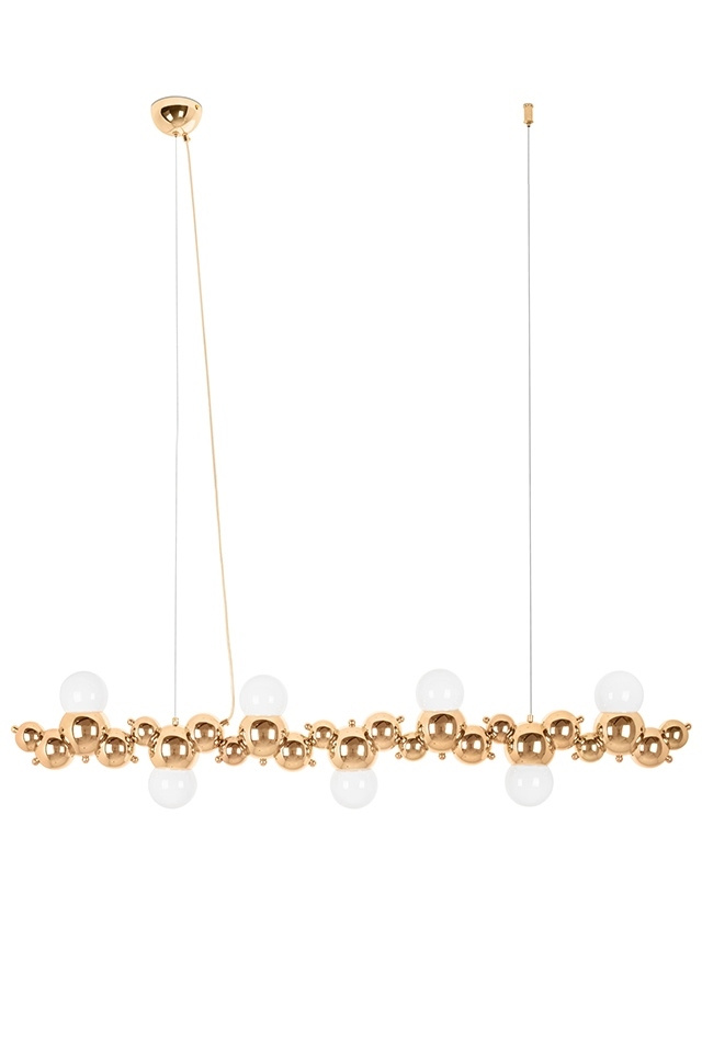 - Lampa wisząca PEARLS 120 złota. Nowoczesna oprawa, której głównym elementem są metalowe kule dekoracyjne ułożone zamiennie w różnych rozmiarach. W zestawie znajdują się żarówki w kształcie okrągłych, szklanych kloszy, co dopełnia niezwykły kształt lampy.