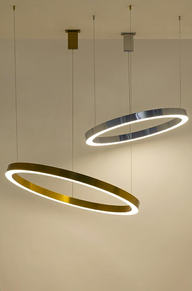 - Lampa Ring 100 wykonana została ze stali nierdzewnej w kolorze złotym. Osłona klosza zrobiona z mlecznego tworzywa sztucznego. Okrągły kształt, oraz źródło światła LED zapewniają optymalne oświetlenie pomieszczenia. Lampa sprzedawana wraz ze źródłem świat