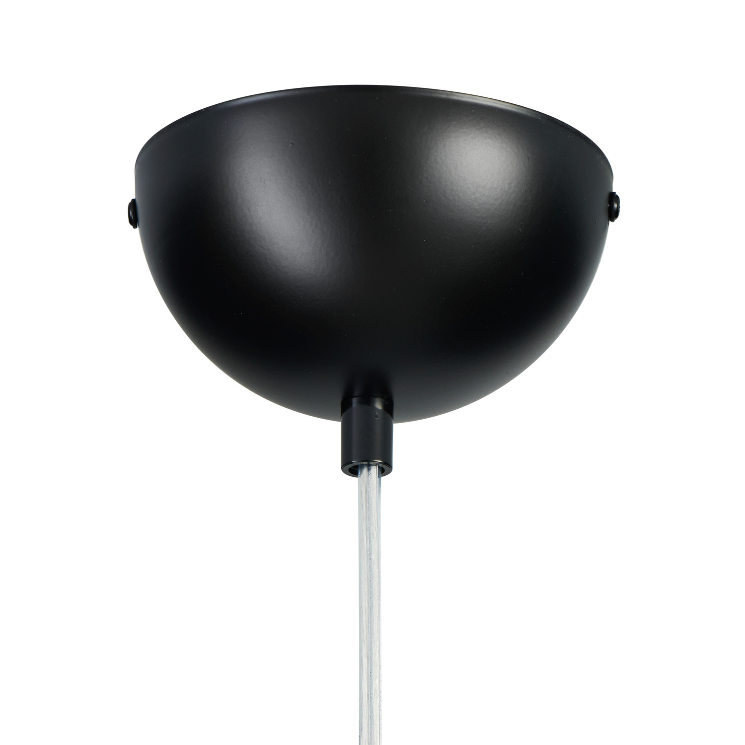 Wewnątrz klosza umieszczona jest czarna metalowa konstrukcja lampy zakończona źródłem światła.