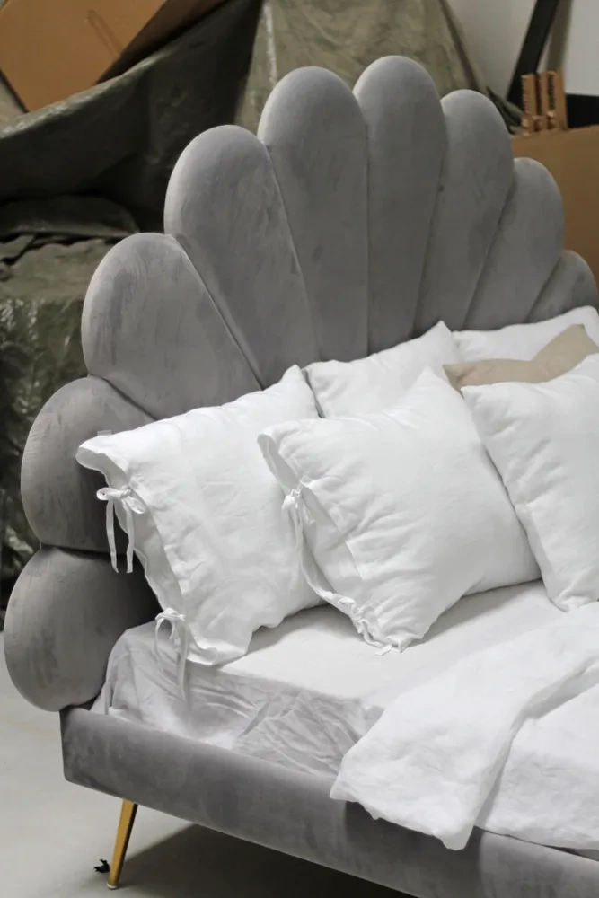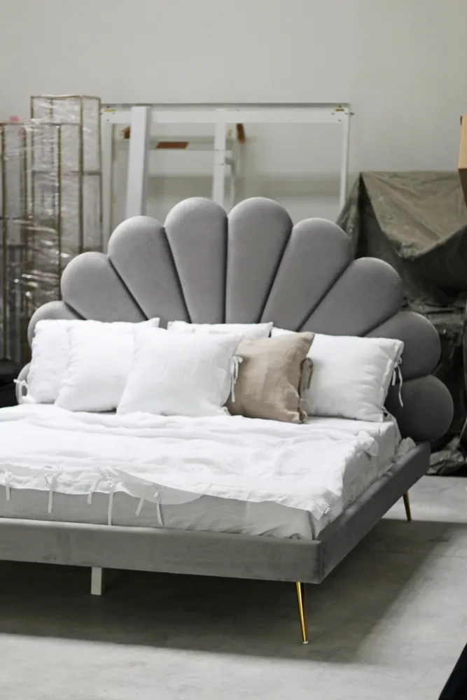 Nasze łóżko z tapicerowanym zagłówkiem w kształcie kwiatu zostało usadowione na stabilnej ramie, opartej na eleganckich i klasycznych stalowych nogach w kolorze złotym.