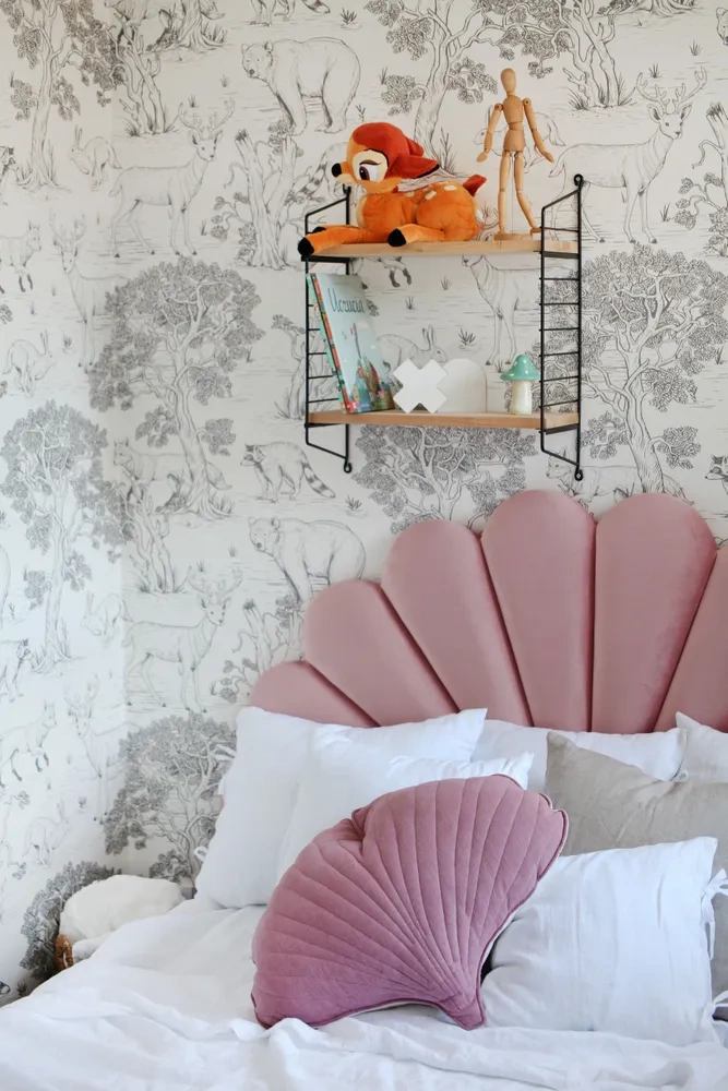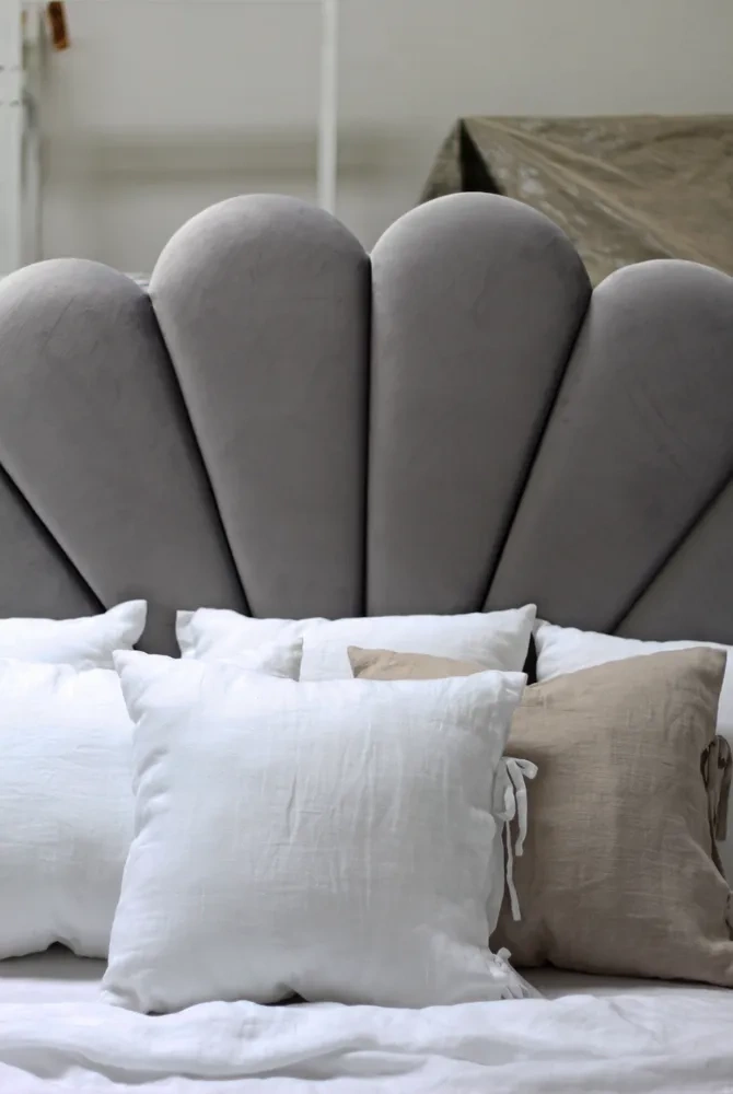Zagłówek łóżka oraz rama łóżka są tapicerowane wybraną tkaniną z serii Velvie. Jest to materiał, który pięknie ,,pracuje” i przyjmuje odmienny wygląd, w zależności od kąta padającego światła i ułożenia delikatnego włosa.