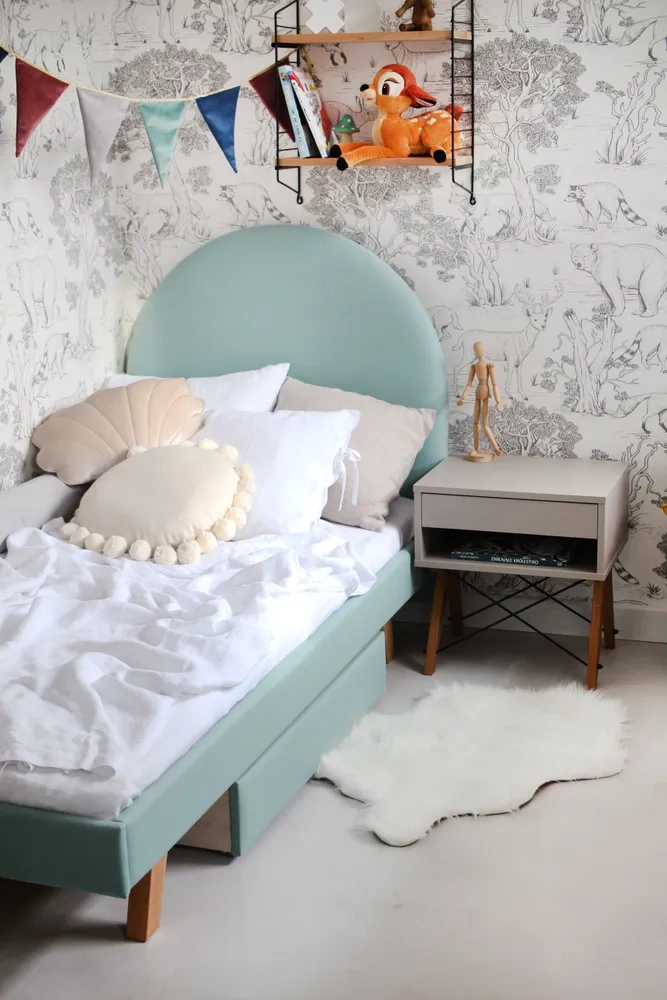 Łóżko dziecięce tapicerowane z półokrągłym zagłówkiem Pille Legs Texti wyprodukowane zostało z najwyższej jakości materiałów w rodzinnej manufakturze MINKO. Tapicerowane łóżko na drewnianych nóżkach to estetyczny i funkcjonalny mebel, który przyniesie Twojemu dziecku w nocy spokojny, komfortowy sen, a w dzień będzie idealnym miejscem do nauki i zabawy.