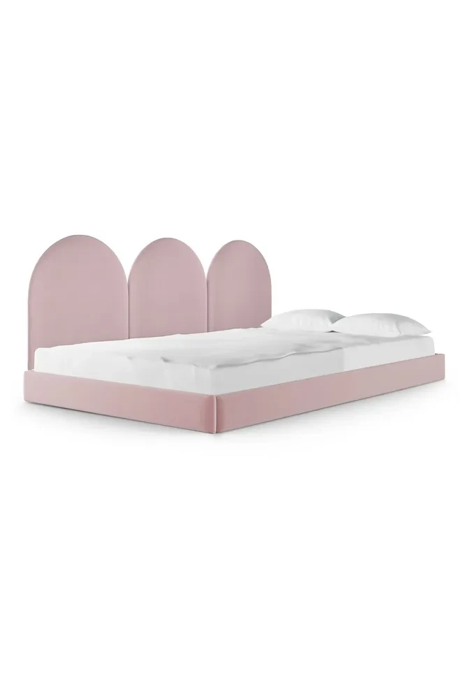 Łóżko ma tapicerowany zagłówek oraz tapicerowaną ramę.