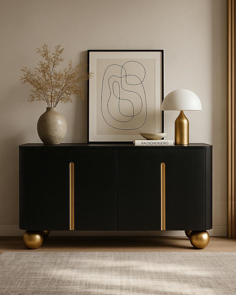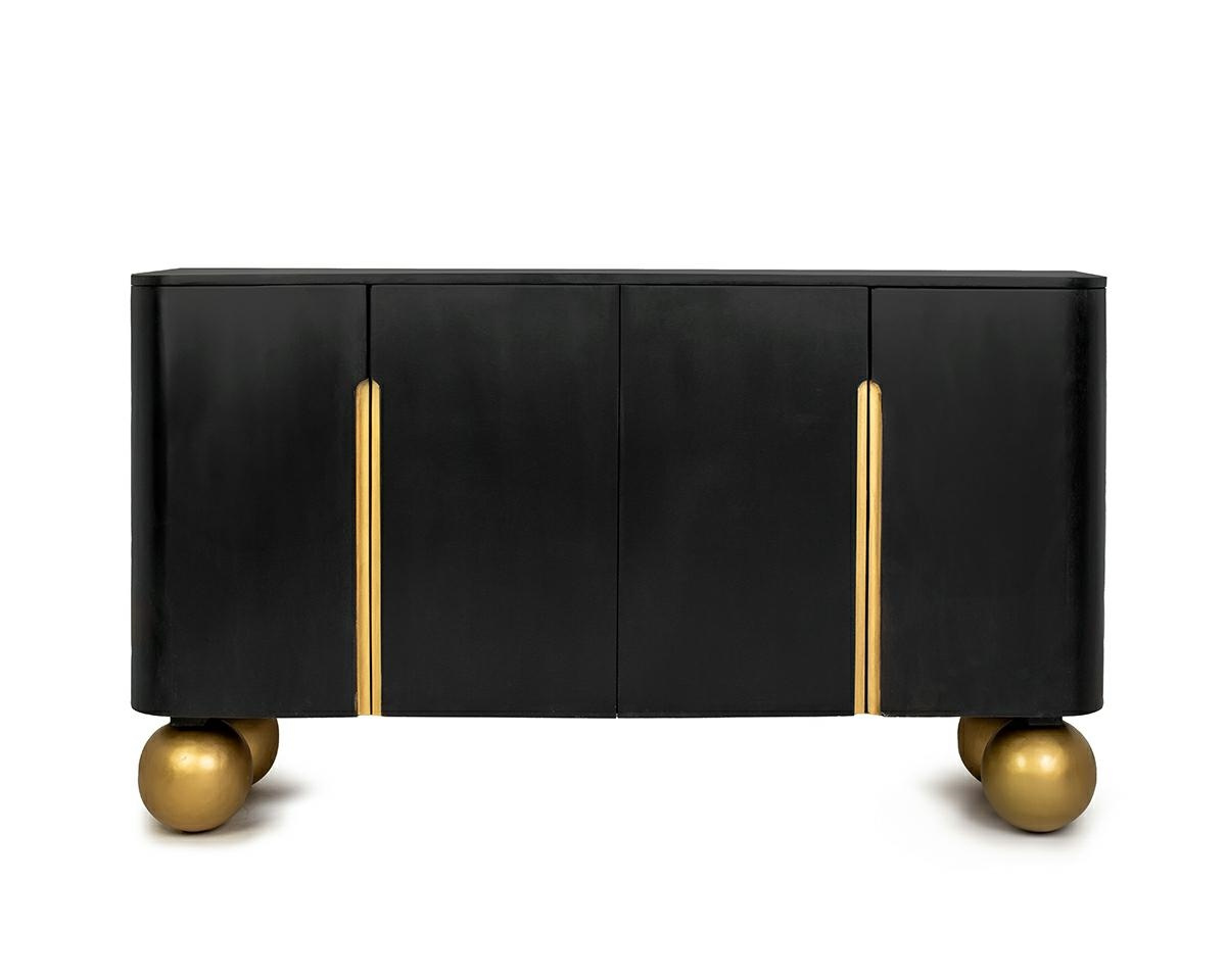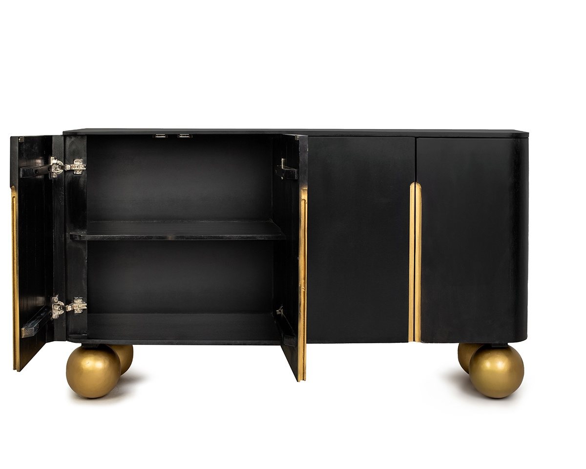 Wykonany z wysokiej jakości drewna mango, zachwyca głęboką czernią przełamaną złotymi detalami – zarówno w postaci uchwytów, jak i efektownych, kulistych nóg.