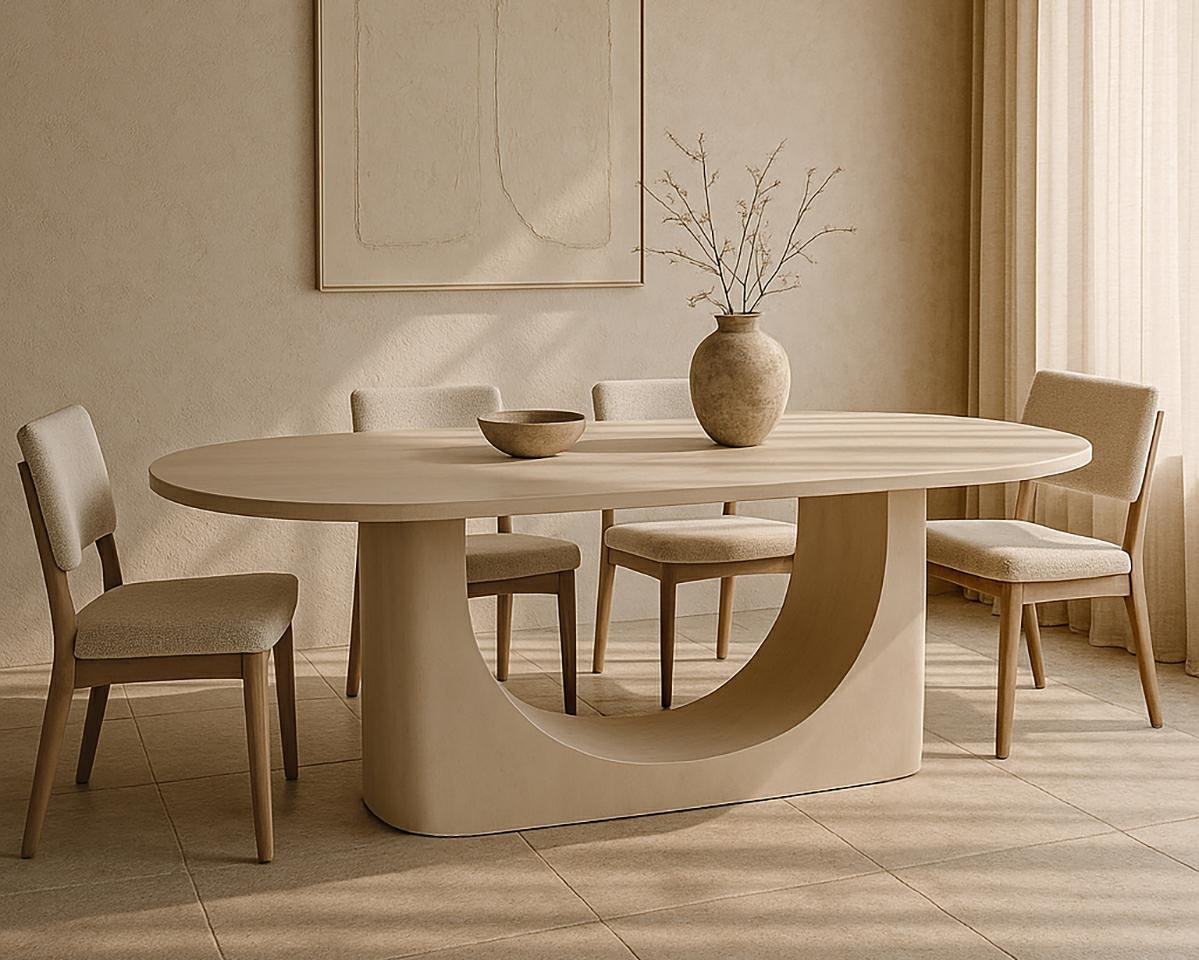 Stół w całości wykonany z drewna mango w eleganckim beżowym odcieniu, przyciąga wzrok unikalną podstawą w formie łuku, która nadaje mu lekkości i architektonicznego wyrazu. Zaokrąglony blat dopełnia całość, tworząc harmonijną i płynną linię.