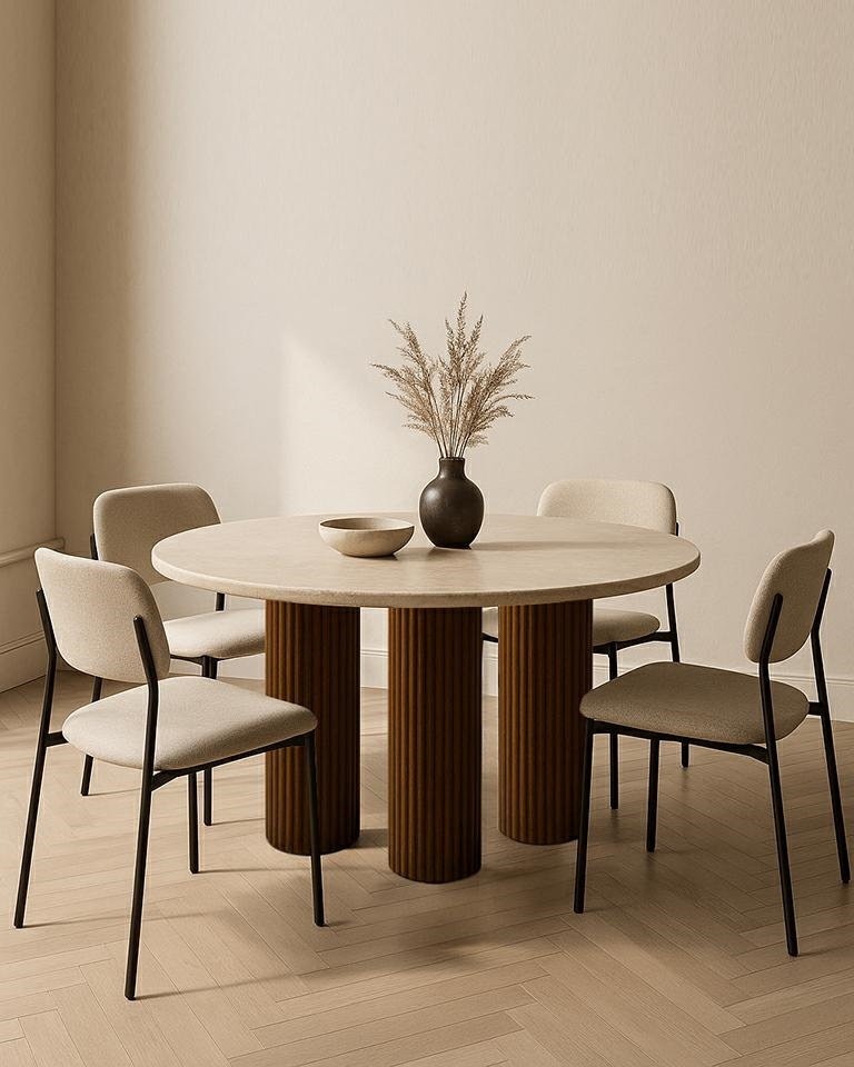 • MaMaison stół jadalniany RAGNO 120 drewno / marmur Wyraz elegancji inspirowanej naturą i klasyczną formą we współczesnym wydaniu. Blat wykonany z marmuru Boto Chino zachwyca jasną, beżową tonacją z subtelnym, naturalnym użyleniem, które czyni każdy egzemp