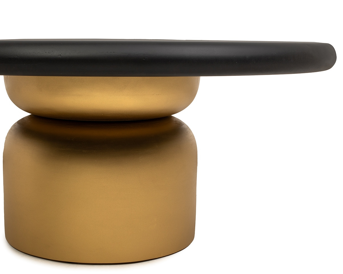 Podstawa stolika w złotym odcieniu emanuje elegancją, luksusem i subtelną ekstrawagancją, wprowadzając do wnętrza ponadczasowy blask, ciemny blat z kolei dodaje przestrzeni elegancji, spokoju i głębi, razem tworzą idealne połączenie, które harmonijnie łączy luksus z wyważoną formą.